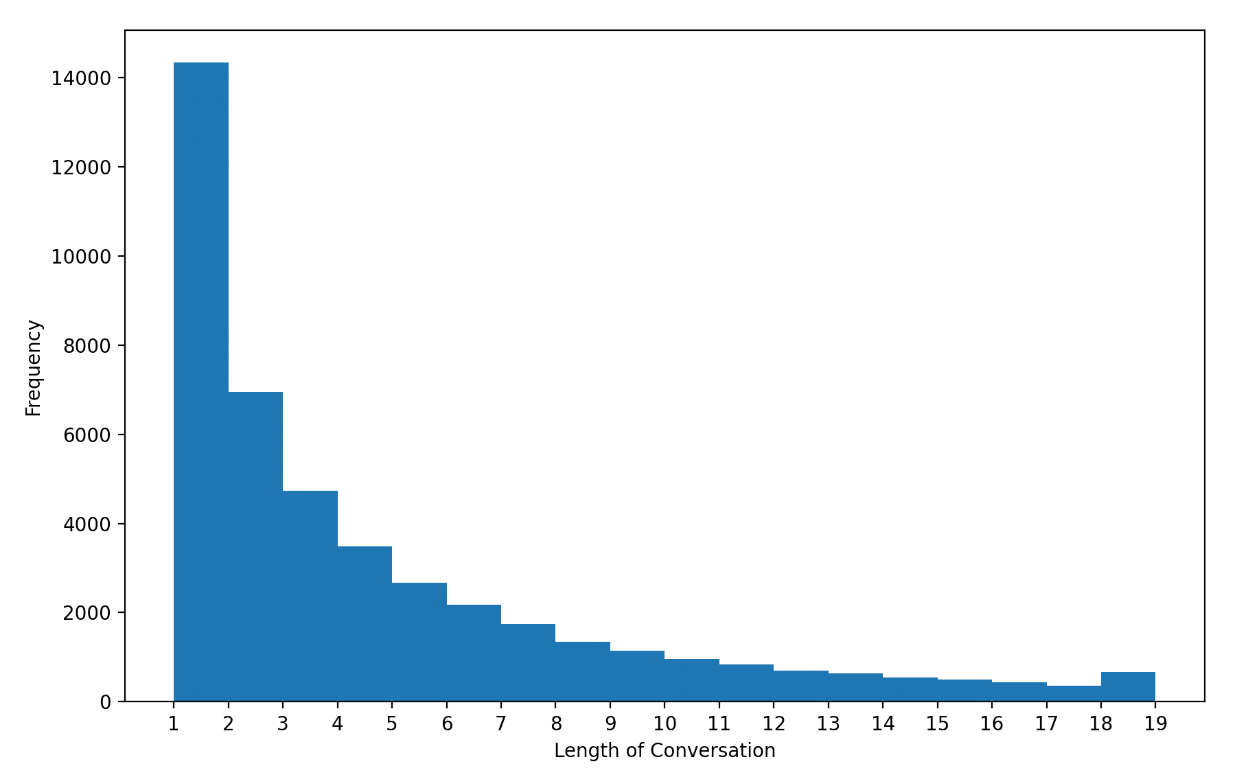 続いて会話の長さのデータです。一回で終わっているケースが一番多いです。20回以上続いているデータもありますが、今回は1回目の会話のやり取りのみを分析対象にしました。