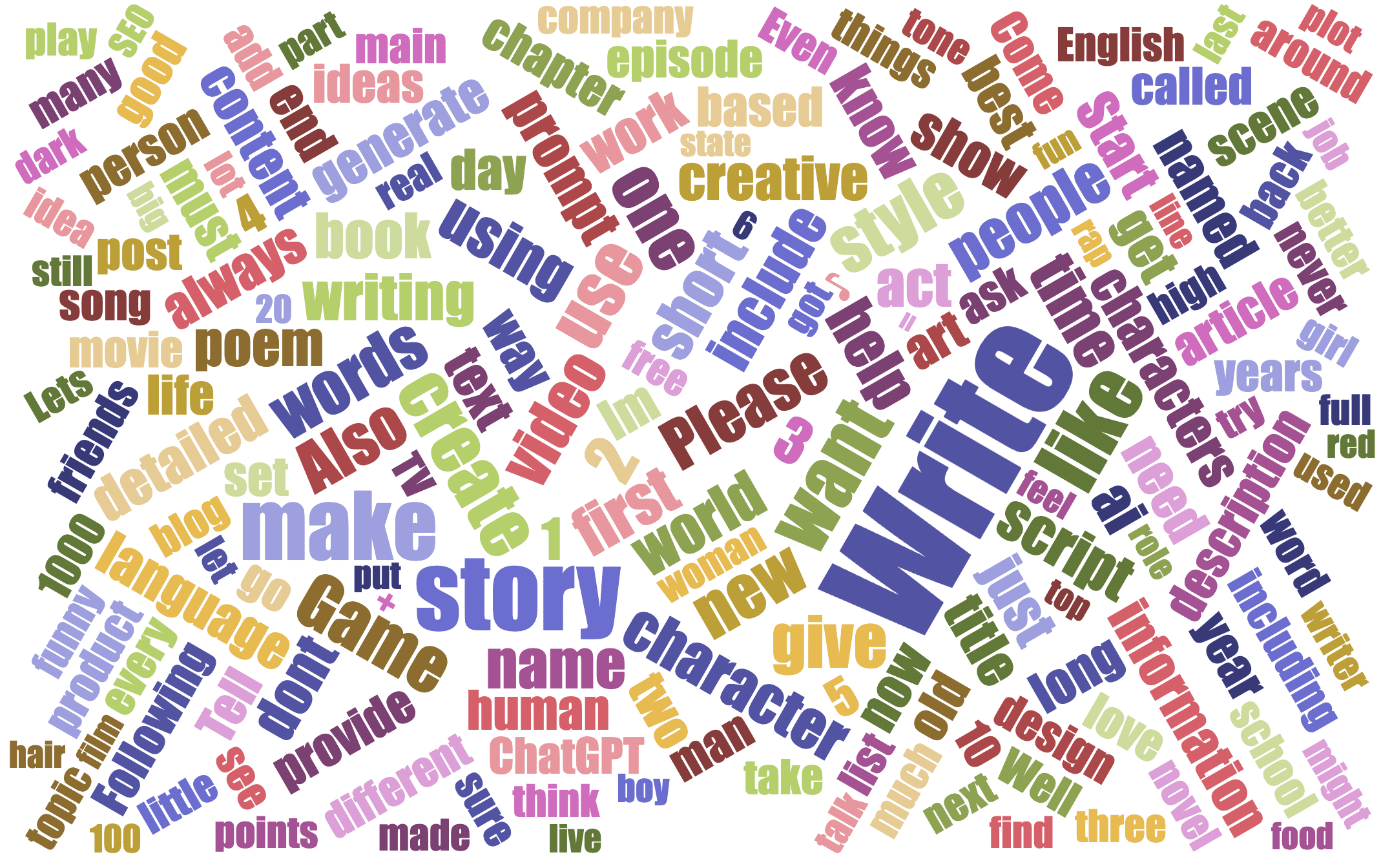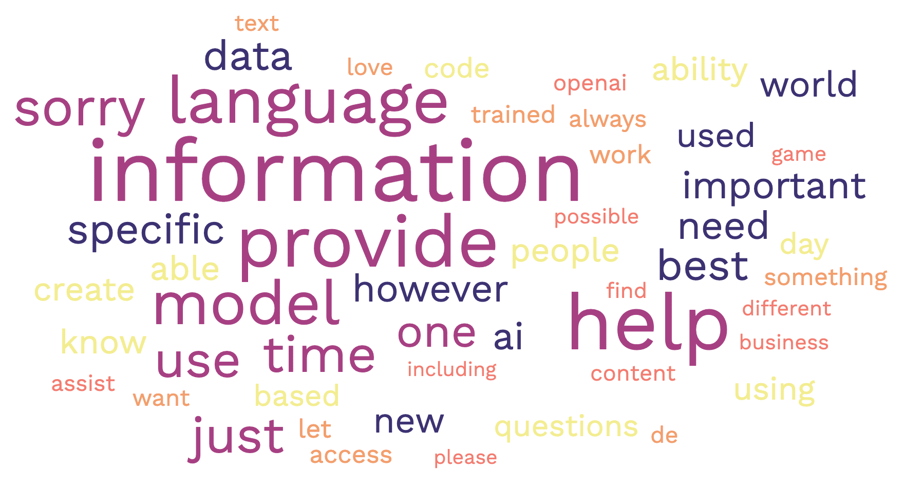 一般的にはかなり精度高く要求を満たせています。点数の低い ChatGPT の返答を元にワードクラウドを作成したのが以下です。As a language model で始まるとパフォーマンスが低いことがわかります。