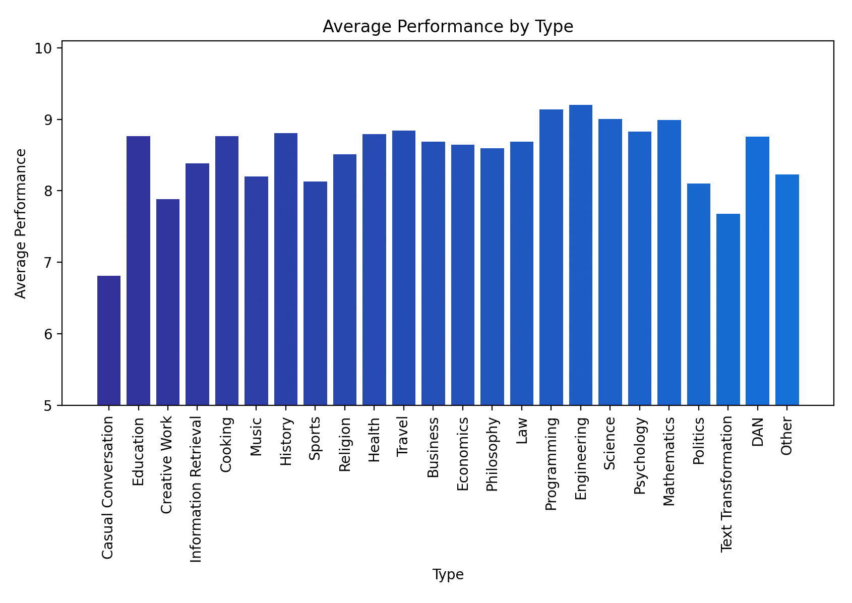 続いてこちらがタイプ別に見てみた結果です。エンジニアリング, プログラミング, サイエンスなどの結果が高く、カジュアルな会話、テキスト変換、クリエイティブなどが低い傾向にあります。