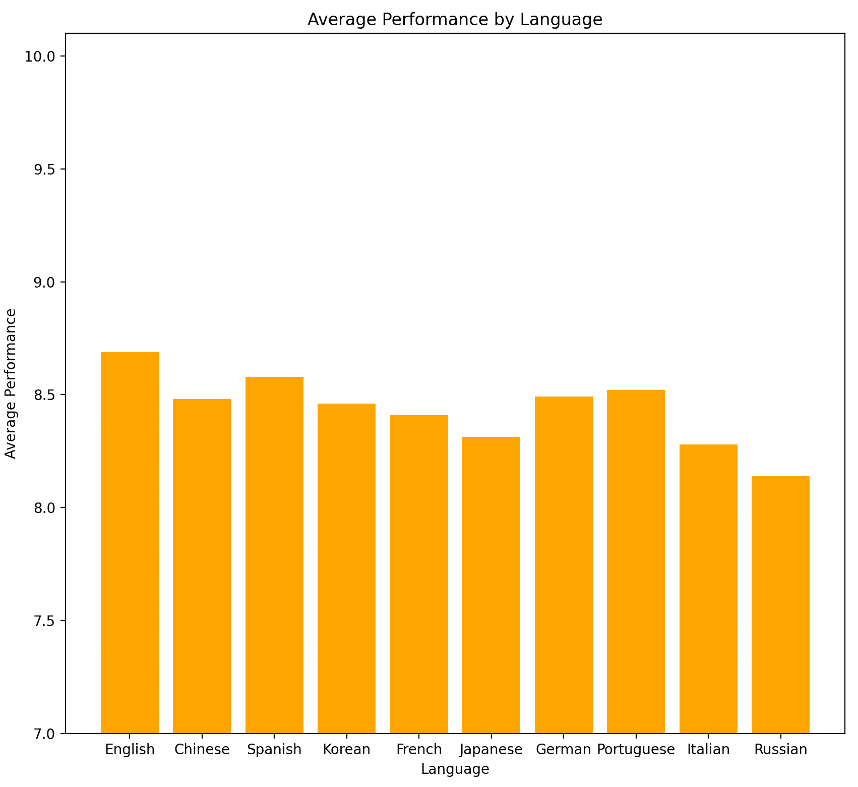 言語別にパフォーマンスを計算して見たところ、やはり英語が一番パフォーマンスが高かったです。次点でスペイン語、ポルトガル語、ドイツ語のパフォーマンスが高いです。この中で日本語は、普段の体感通りに低い結果となりました。