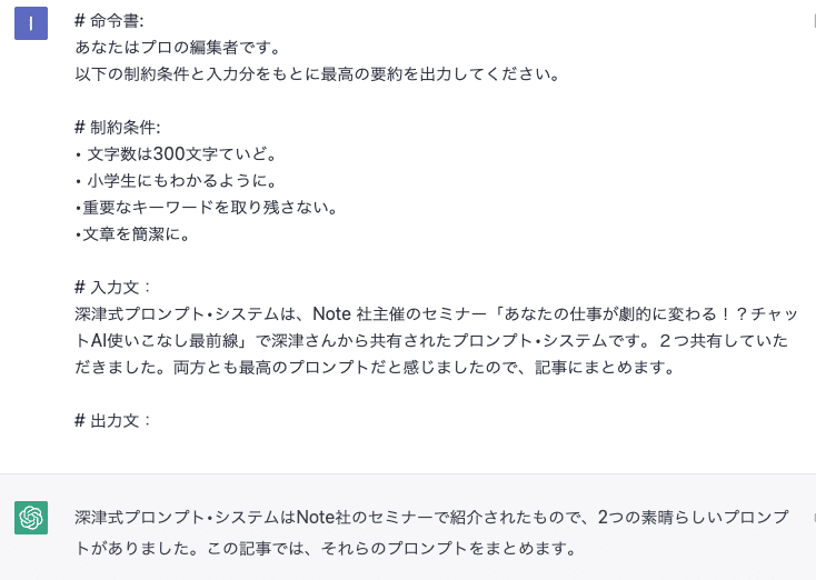 深津式プロンプト・システム1のポイントは、入力と命令を明確に分けることです。具体的なプロンプト例は以下の通りです。