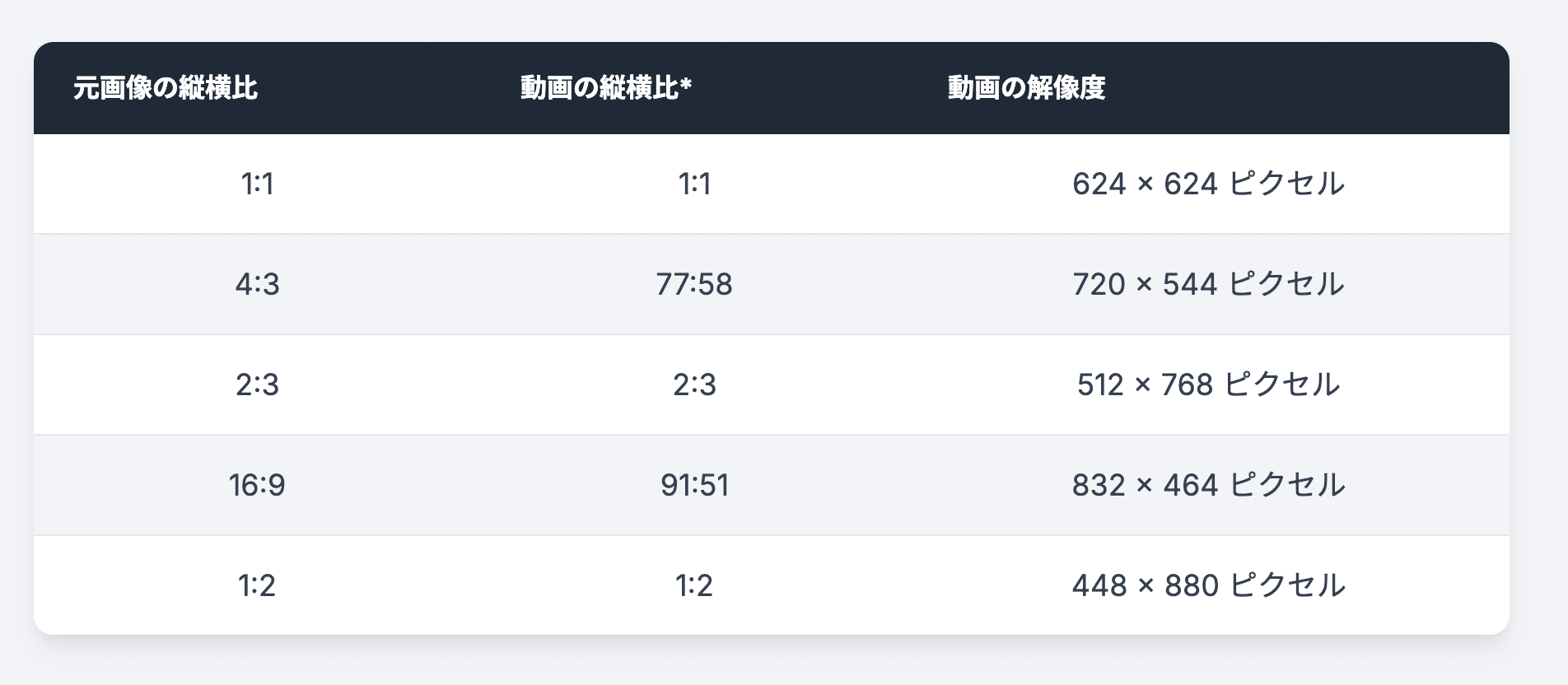 1回の生成で5秒間の動画が4つ生成されます。動画の品質は480p(標準画質)相当ですが、最終的なピクセル数は元画像の縦横比によって変わります。