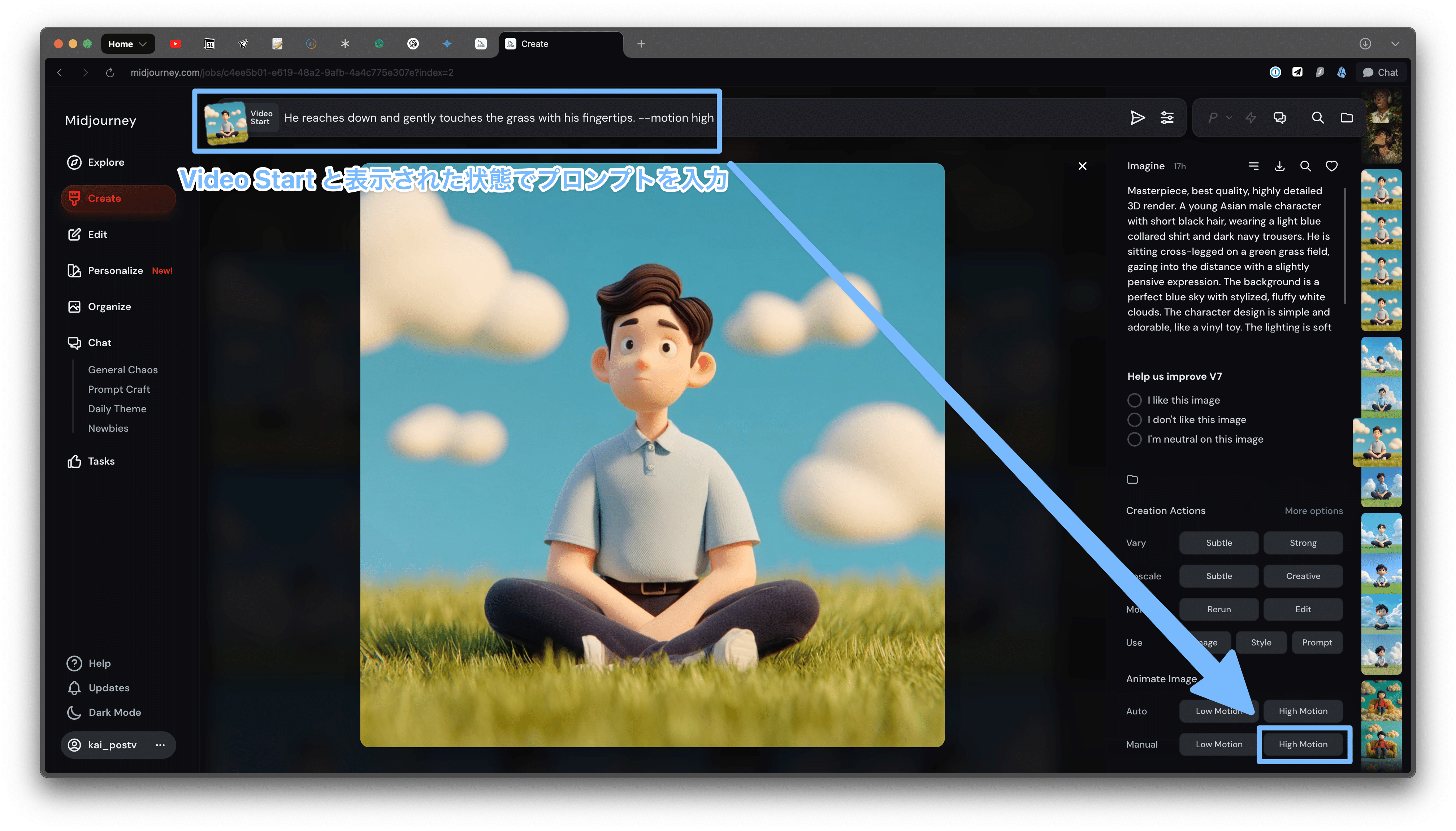 次に、生成した画像を選択し、画面左下のコントロールパネルから「Manual」の「High Motion」ボタンを押して、キャラクターの最初の行動を指示します。