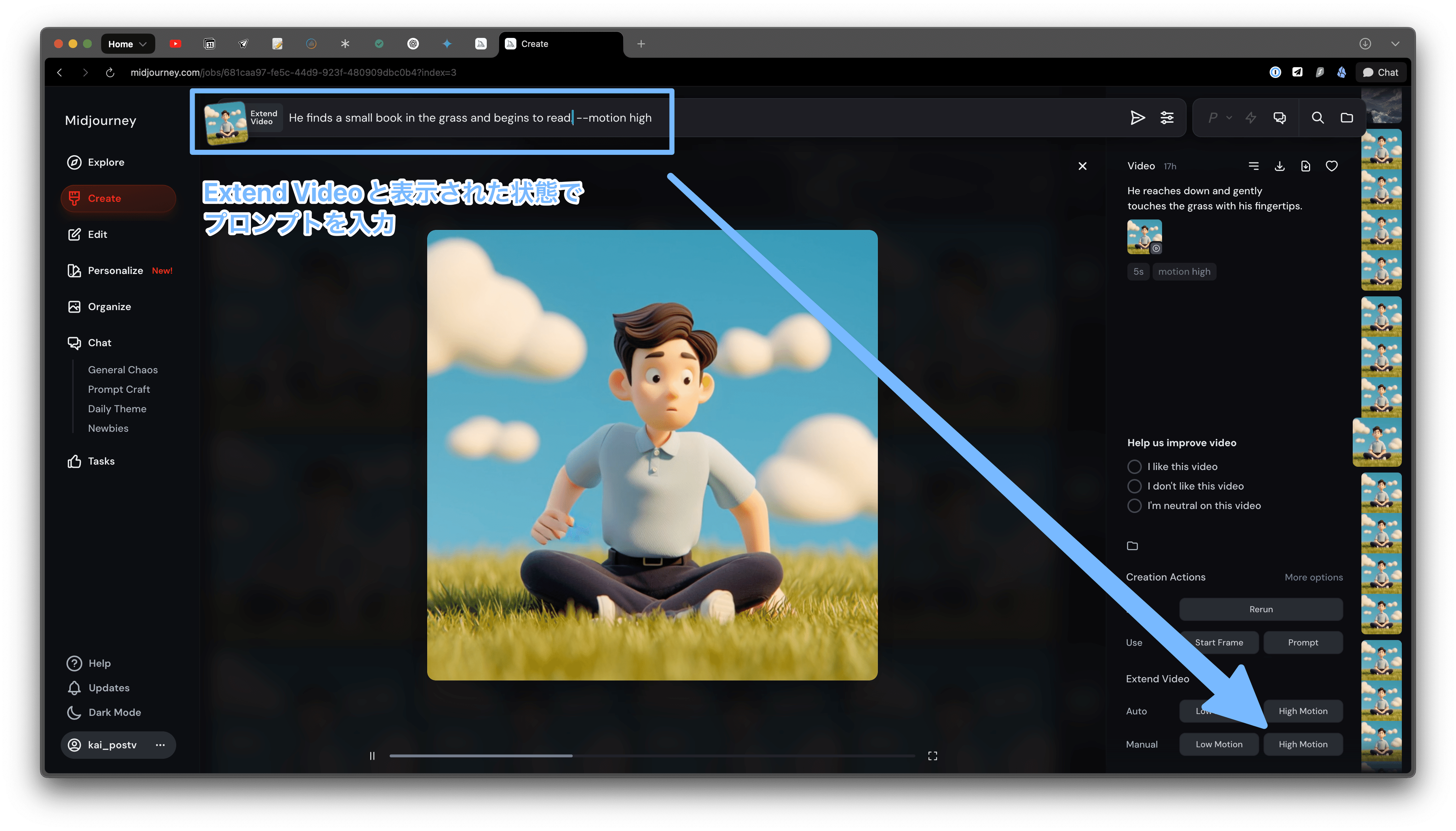 最初の動画が生成されたら、その下にある「Extend」ボタンで物語の続きを作ります。今度は、草むらの中から本を見つけ出して読み始める、という行動に繋げてみましょう。