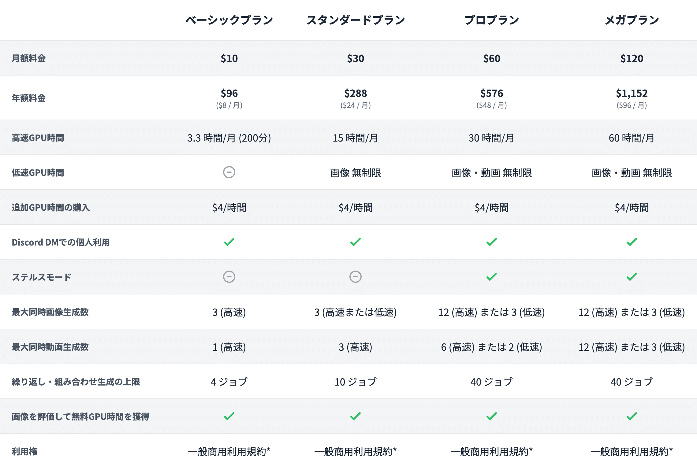 * Fast GPU時間とは、画像を高速で生成するための専用時間(クレジット)です。各プランに定められた時間を使い切ると、追加購入が必要になります。