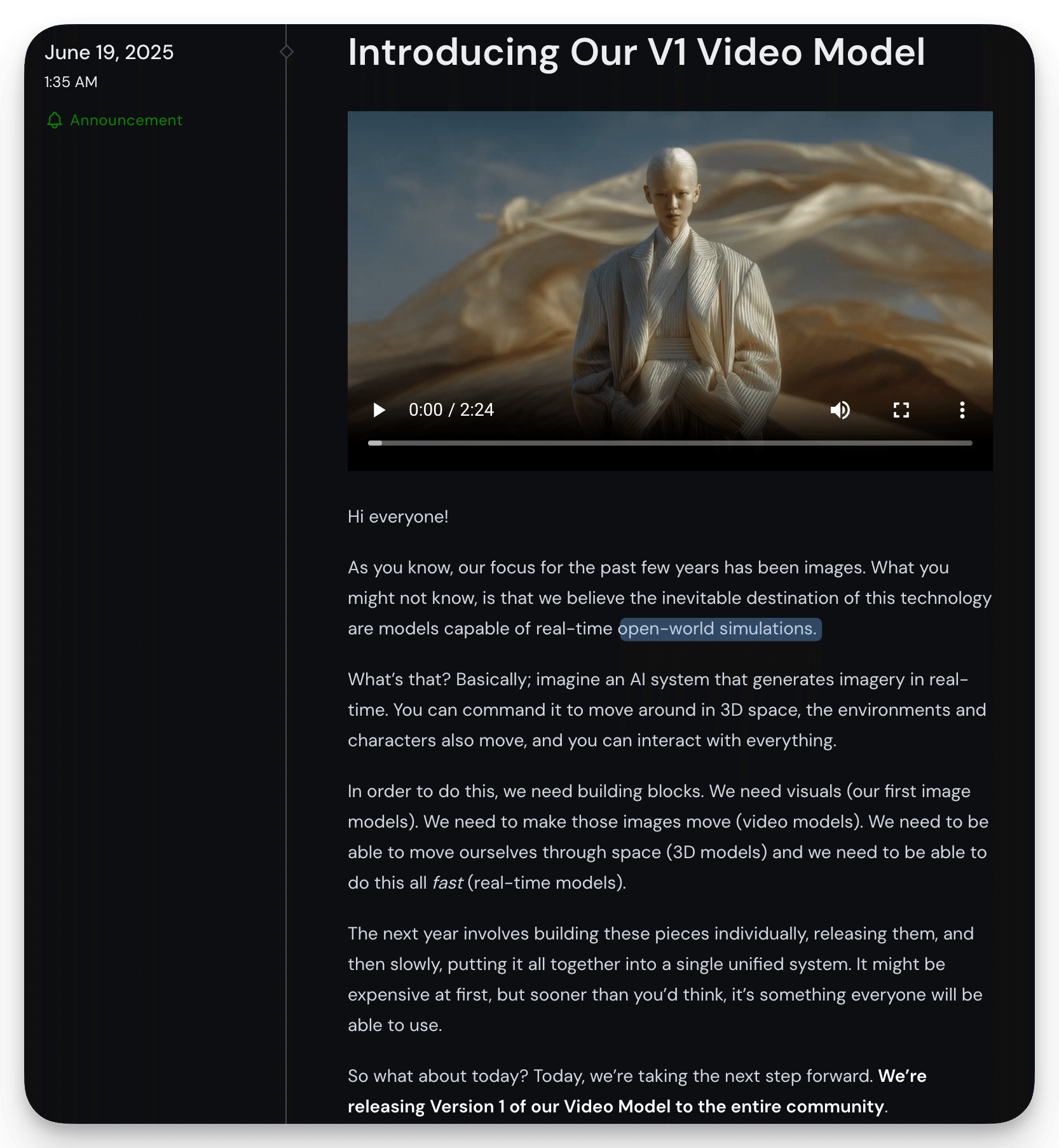 公式アナウンスの中で、創設者David Holzさんは、この動画機能は最終目標である「リアルタイムのオープンワールド・シミュレーション」を実現するための、重要な一歩であると話しており、さらに以下のようなロードマップを示しています。