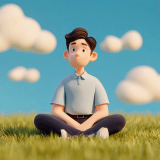 Masterpiece, best quality, highly detailed 3D render. A young Asian male character with short black hair, wearing a light blue collared shirt and dark navy trousers. He is sitting cross-legged on a green grass field, gazing into the distance with a slightly pensive expression. The background is a perfect blue sky with stylized, fluffy white clouds. The character design is simple and adorable, like a vinyl toy. The lighting is soft with minimal shadows.