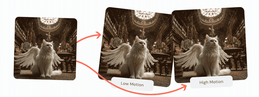 `--motion high`: ダイナミックな動きを加えたい場合に使用します。カメラと被写体が大きく動きますが、意図しない不自然な動き(グリッチ)が生じる可能性もあります。