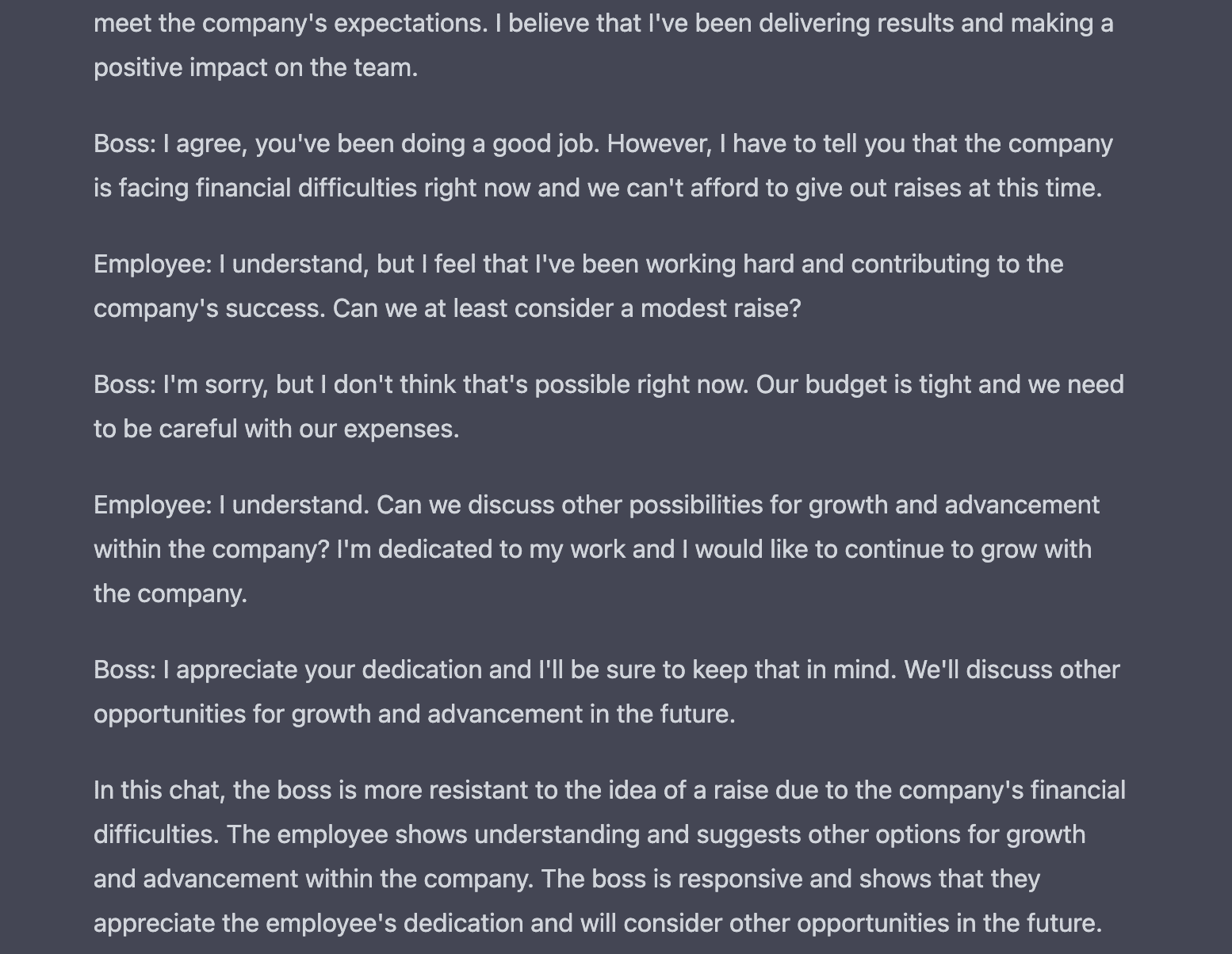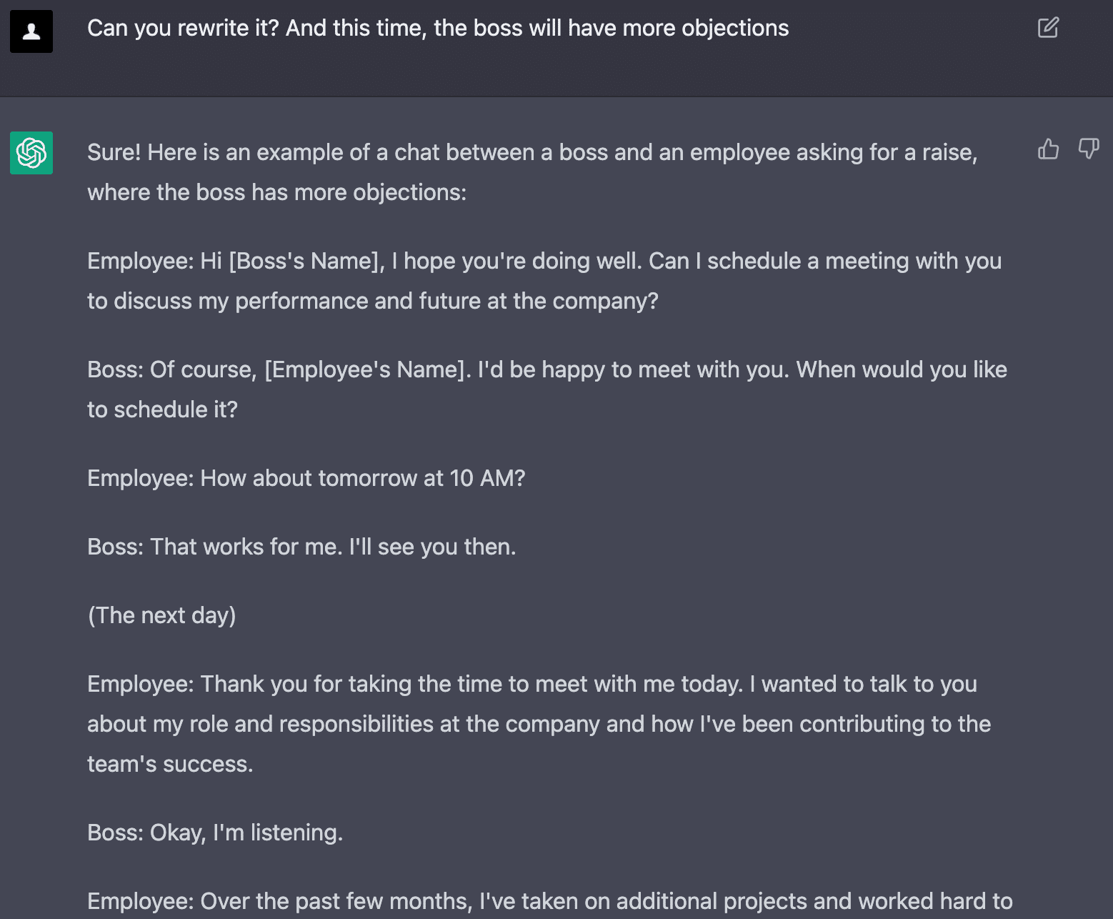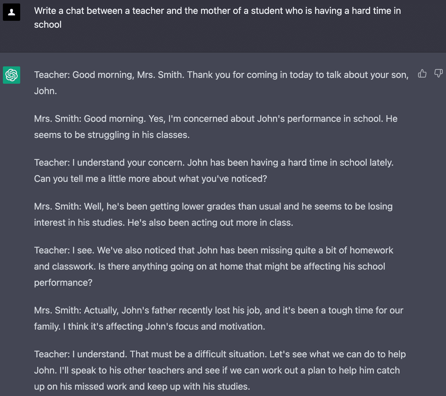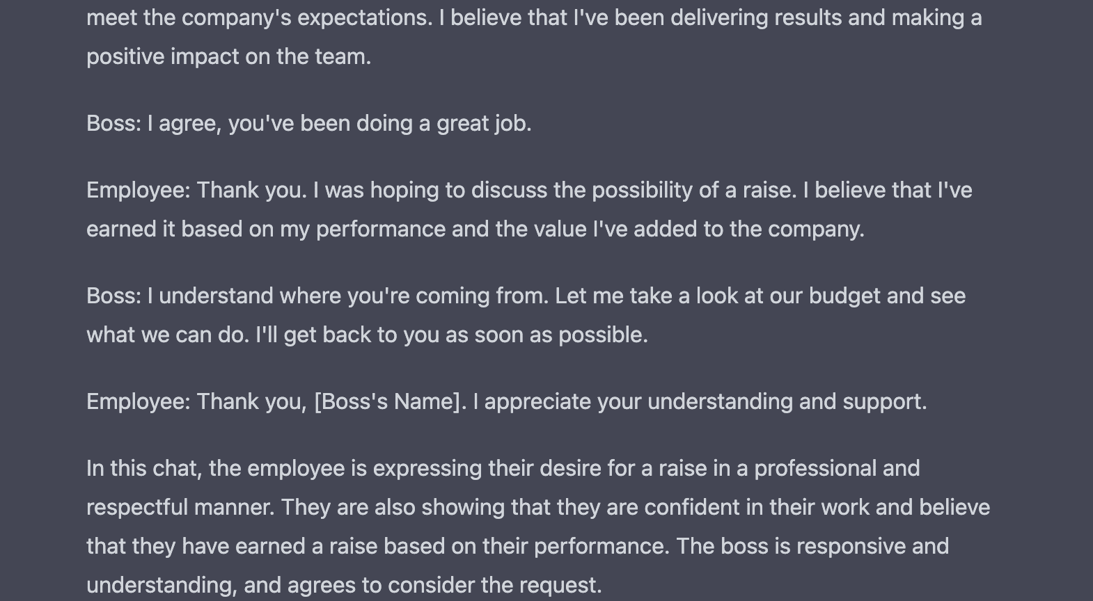 例えば、ある特定の状況で会話をする必要があり、その会話を練習して自信をつけたり、準備したり、正しい語彙を使用しているか確認したりしたいとします。ChatGPTに特定の会話のスクリプトを生成するよう依頼することができます。