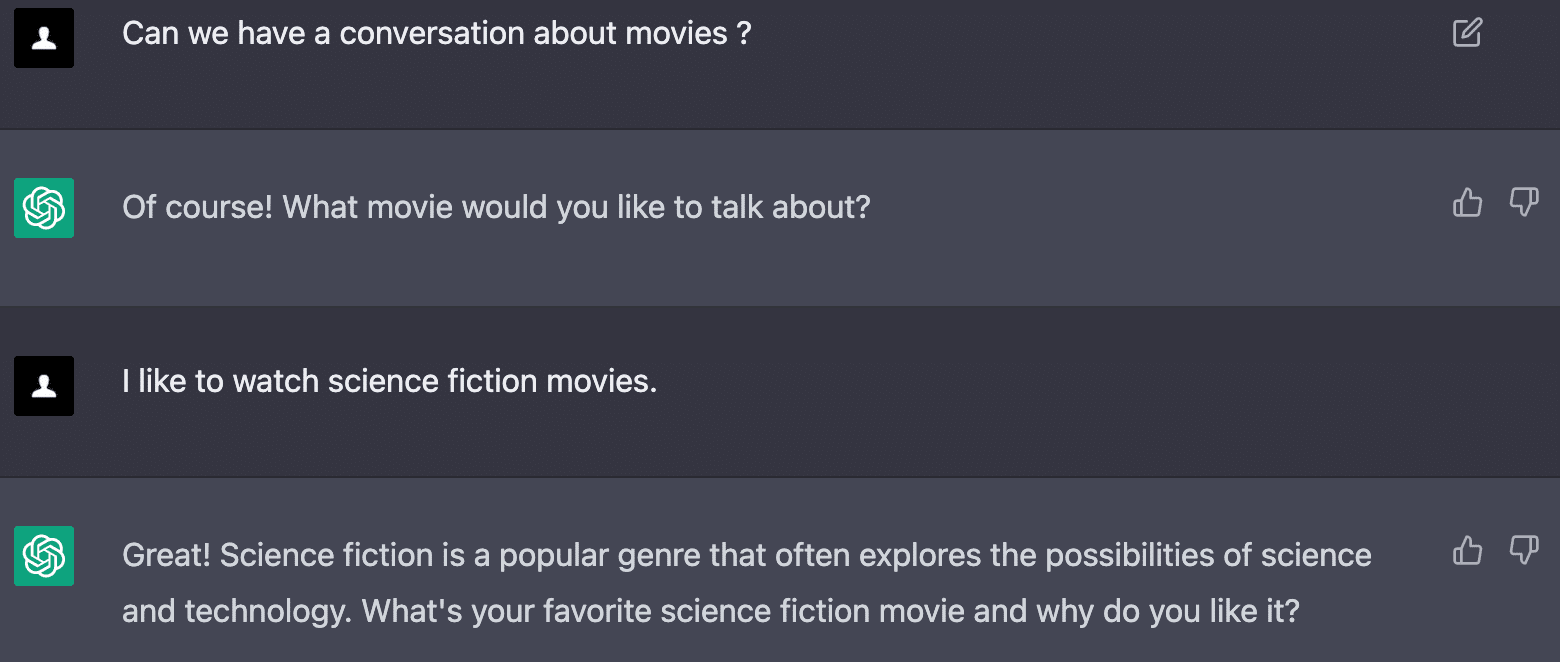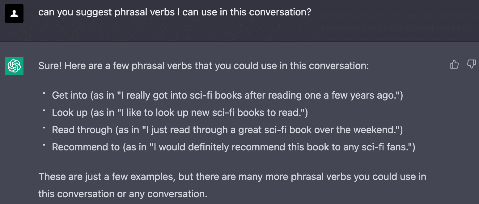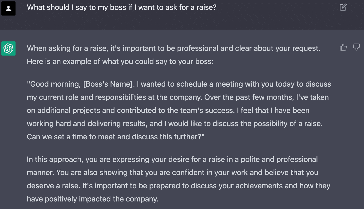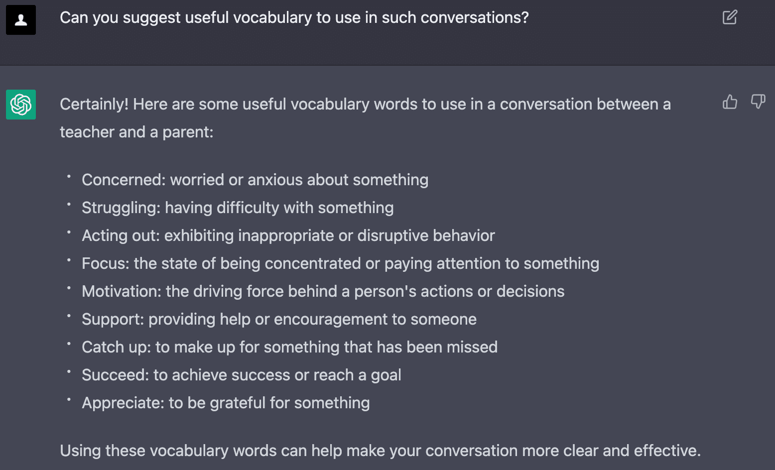 例えば、ある特定の状況で会話をする必要があり、その会話を練習して自信をつけたり、準備したり、正しい語彙を使用しているか確認したりしたいとします。ChatGPTに特定の会話のスクリプトを生成するよう依頼することができます。
