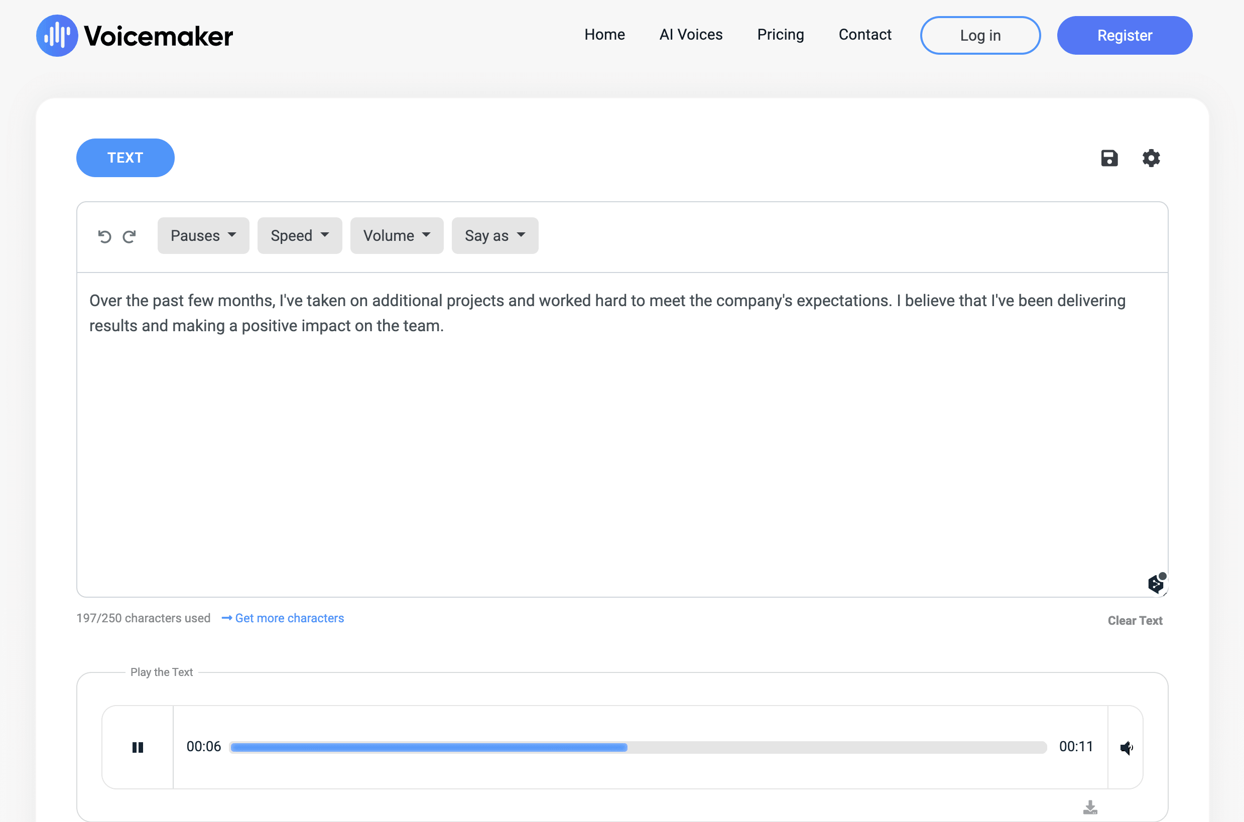 ChatGPTが会話を作成したら、その会話をテキスト音声変換ソフトにコピーペーストして、人間の自然な音声で会話を再生できます(もちろん、それほど自然ではありませんが、それでも非常に便利です)。例えば、NaturalReadersやVoicemakerなどです。再生時には、一時停止や繰り返しもできます。
