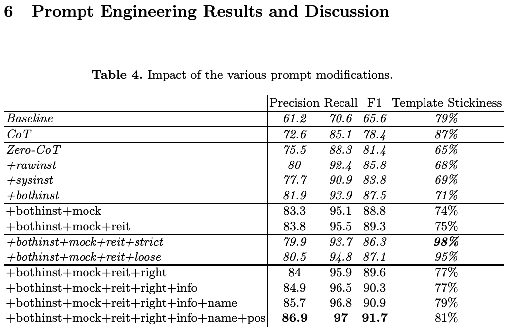 適切なプロンプトエンジニアリングを活用することで、GPT-3.5は95%のリコールと86.9%の精度を示し、他のモデルを凌ぐ結果を出しました。