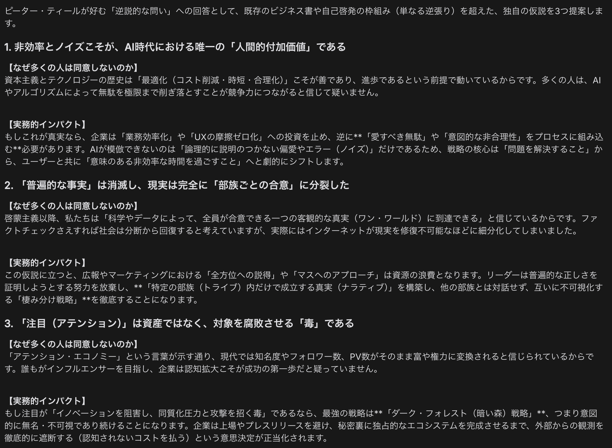 正直に言うと、一読しただけでは即座に良し悪しを判断できないほど難解で、深みのある内容だと感じます。「非効率とノイズこそが人間的付加価値」「現実は部族ごとの合意に分裂した」など、2.5 Proと比べると視座が一段高い印象です。