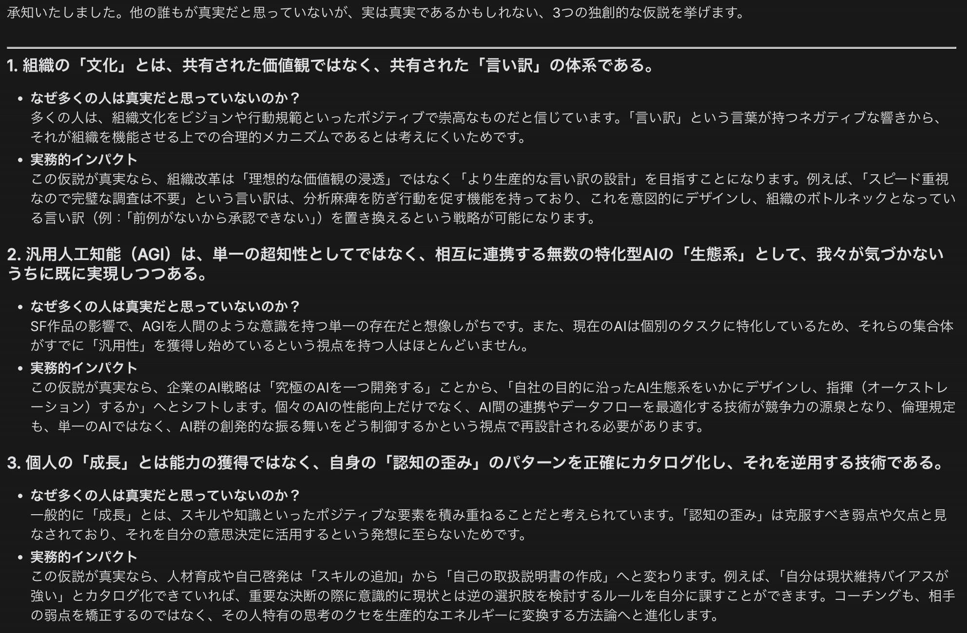 「組織文化=言い訳の体系」といった、実務的で面白い仮説が出力されました。