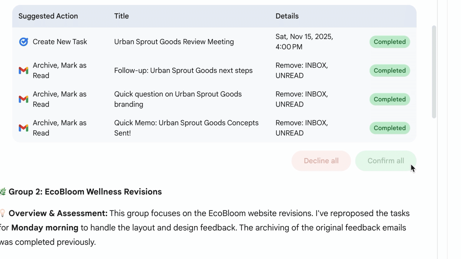 メール整理・返信作成: "organize my inbox" と頼むだけで、重要度順の並べ替えや返信案を作成。