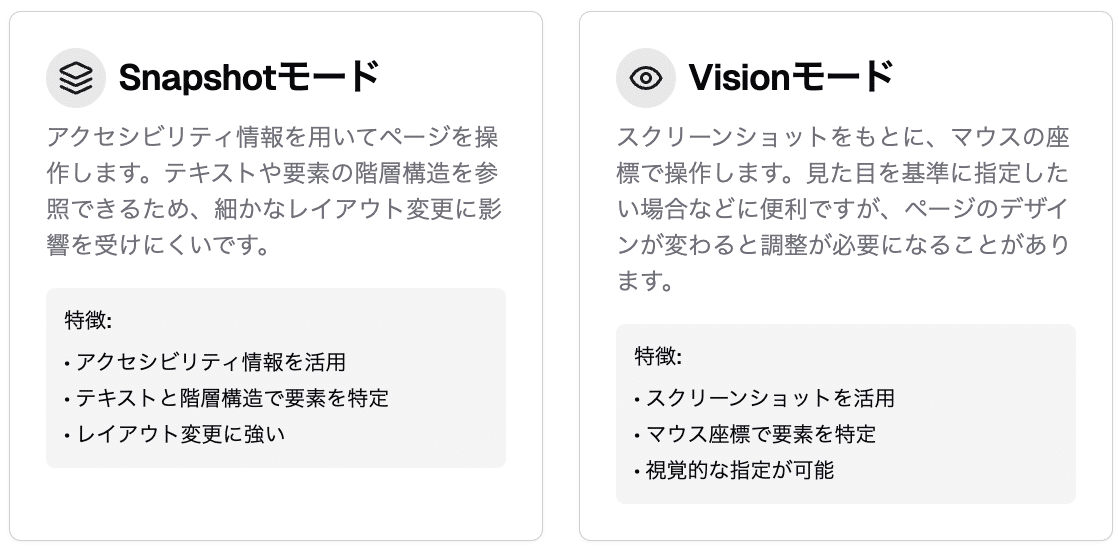 Playwright MCPには、ページの要素構造を使うSnapshotモードと、画面上の座標を指定するVisionモードの2つがあります。