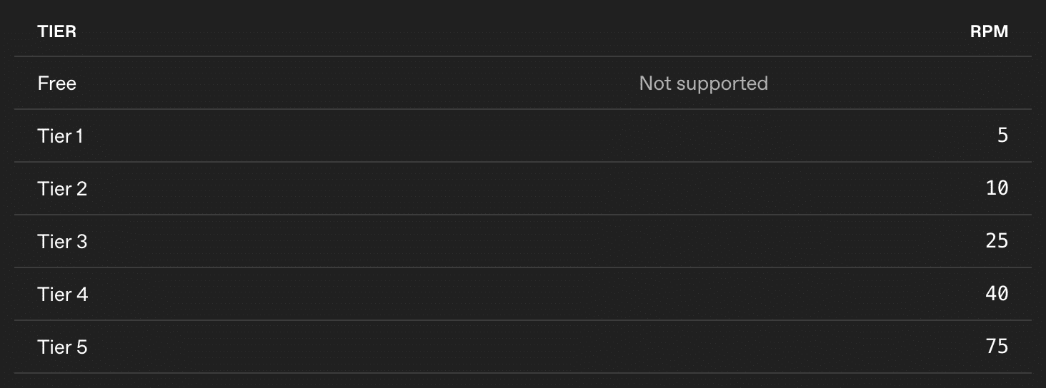 Sora 2 APIの利用には、OpenAI APIのTier 1以上のアカウントが必要です。Tierによって、1分間あたりのリクエスト数の上限が定められています: