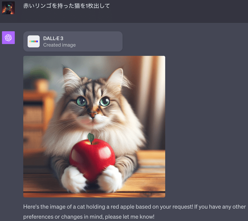 例えば、「赤いリンゴを持った猫を出して」と入力すると、以下のような画像が生成されます。画像は以前は自動的に4枚生成されましたが、現在は2枚生成されます。