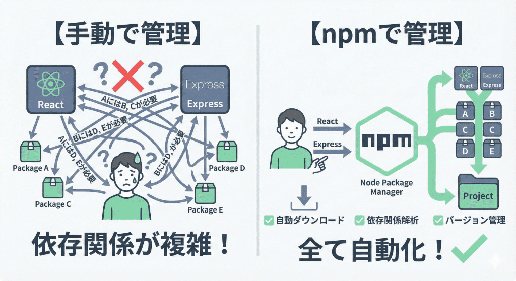 これを人間が手動で管理するのは大変です。そこで登場するのがnpm(Node Package Manager)です。