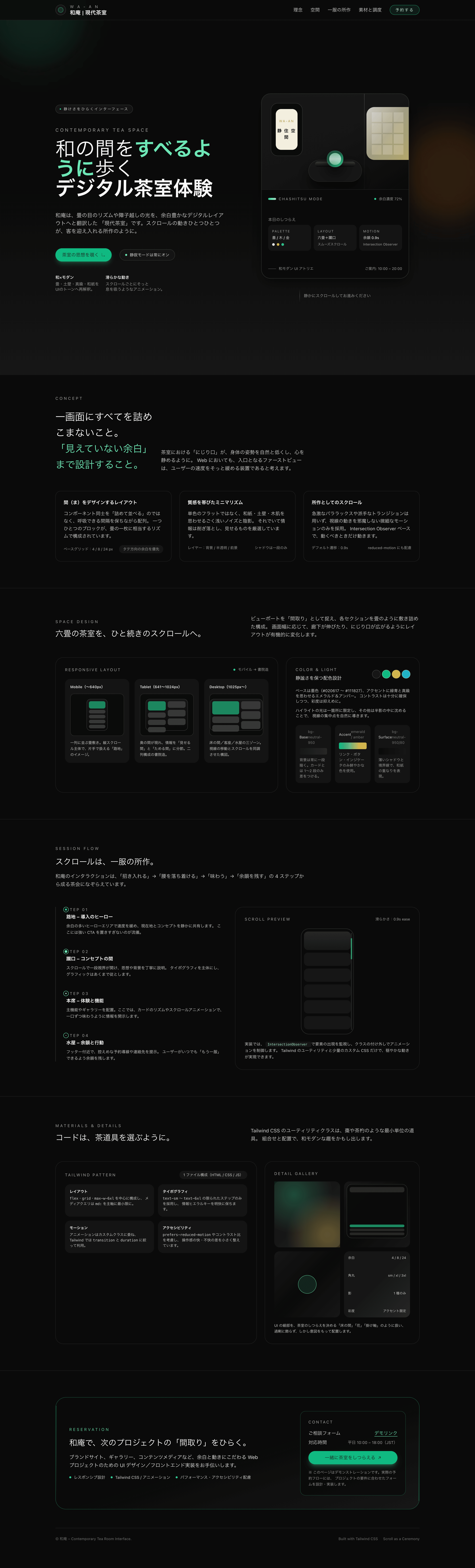 和モダンな茶室の美学を基調とした Web ページを制作してください。創造性を最大限発揮し、デザイン・構成ともに独創的な表現を追求してください。スムーズなスクロールアニメーション、静謐でありつつ調和のとれた配色、Tailwind CSS を使ったスタイル表現を盛り込み、レスポンシブも必須とします。コードは 1 ファイルにまとめて出力してください。ページタイトルは “和庵 | 現代茶室”。判断が分かれる点は、あなたの美的判断に基づき最適だと思う方向へ寄せてください。