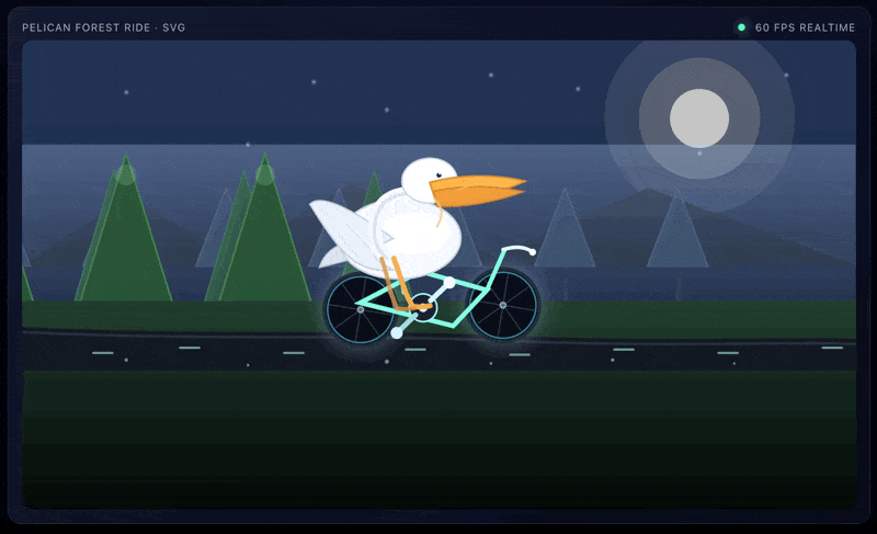 森の中を自転車に乗って走るペリカンの、超詳細なSVGアニメーションを作成してください。60fpsで滑らかに動作する、高品質なコードにしてください。