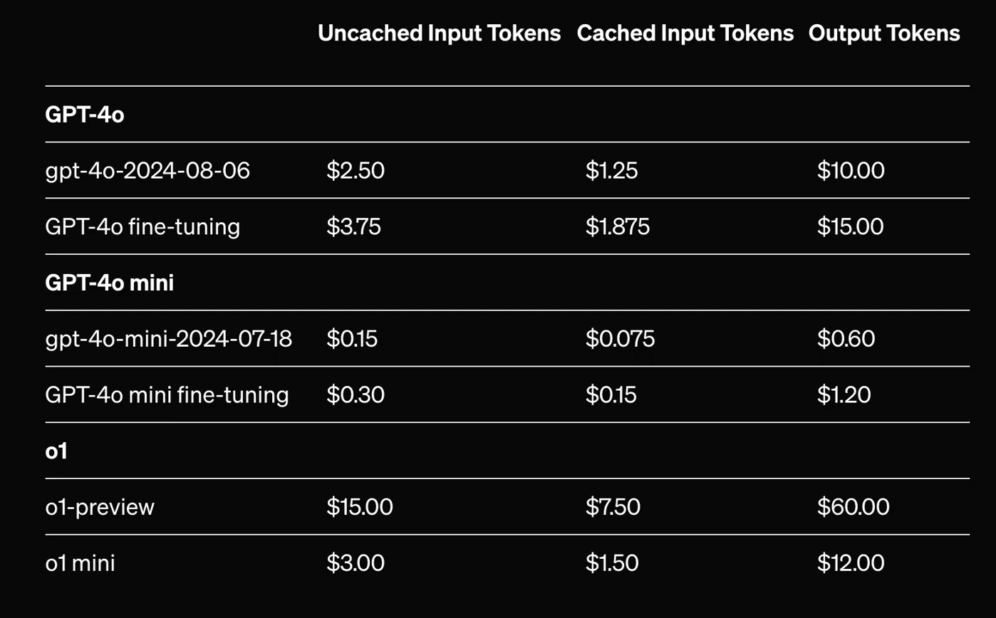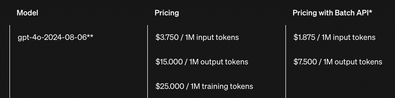 ただし、OpenAIとの共有に同意すれば年内は無料(週7回まで)です。Fine-tuningの価格は標準的な料金と同じです。