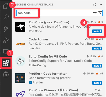 まずは、VS Code上でRoo Codeをインストールしましょう:
