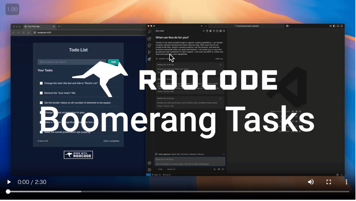 ブーメランタスク(サブタスクやタスク編成とも呼ばれる)は、Roo Codeのカスタムモードを利用したマルチエージェント機能です。その名前の由来は、オーストラリアの伝統的な狩猟具である「ブーメラン」から来ています。ブーメランが投げた場所に戻ってくるように、このシステムでは親タスクから投げ出された(委任された)サブタスクが、完了後に結果を持って親タスクに戻ってくるという動作に基づいています。