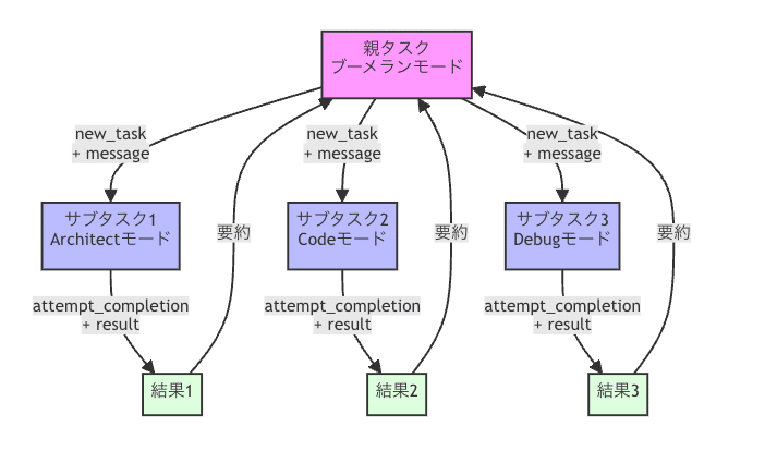 Use subtasks to maintain clarity. If a request significantly shifts focus or requires a different expertise (mode), consider creating a subtask rather than overloading the current one.ブーメランタスクの動作フロー