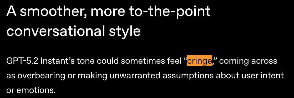 GPT-5.2 Instantのトーンは、時として押し付けがましく感じられたり、ユーザーの意図や感情を勝手に決めつけたりすることがあり、それが「痛々しい(イタい)」印象を与えることがありました。