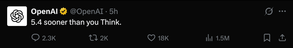 OpenAI公式が「5.4 sooner than you Think.」と投稿したことで混乱も広がっています。GPT-5.3 Instantの公式ブログ末尾には「Thinking and Pro will follow soon.(「思考(Thinking)」と「プロ(Pro)」もまもなく追加予定です。)」と書かれていますが、同日OpenAI公式が「5.4 sooner than you Think.(5.4は、思っているよりもすぐそこだ。)」と投稿しています。