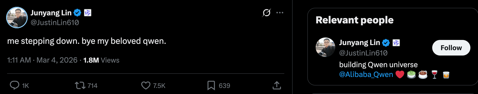 同日、導入でも触れた「中国発モデル」側にも大きな動きがありました。Alibaba QwenチームのTech Leadである Junyang Lin(@JustinLin610) 氏がXで退任を表明しています。前日にQwen 3.5 Smallシリーズをリリースしたばかりで、本人は「final shot(最後の仕事)」と呼んでいました。Alibaba内部でQwenが商業化・マネタイズ重視にシフトする再編が背景にあると見られており、複数のコアメンバーも同時期に離脱しています。