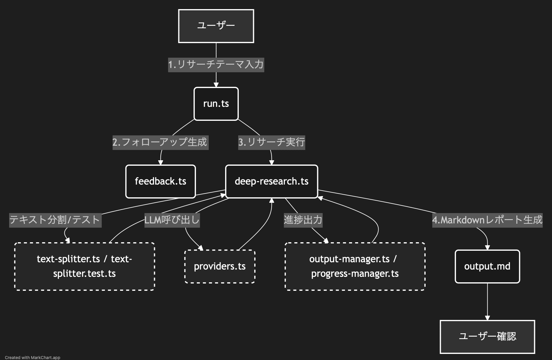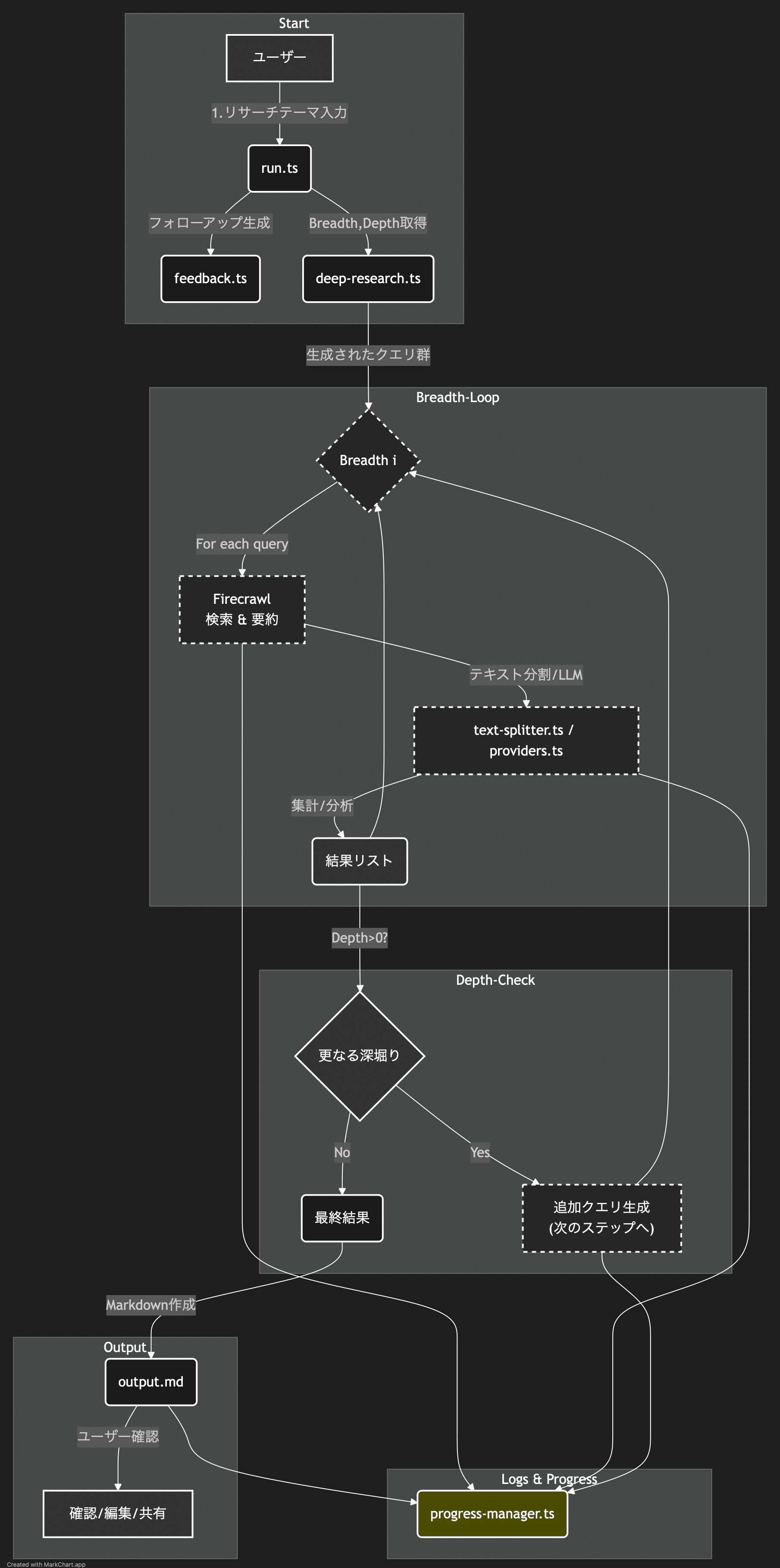 Logs & Progress: 検索や分析の各ステップでログを出力し、ユーザーが進行状況を把握できるようにします。最終的にoutput.mdが生成されると、ユーザーはその報告書を確認・編集して利用します。