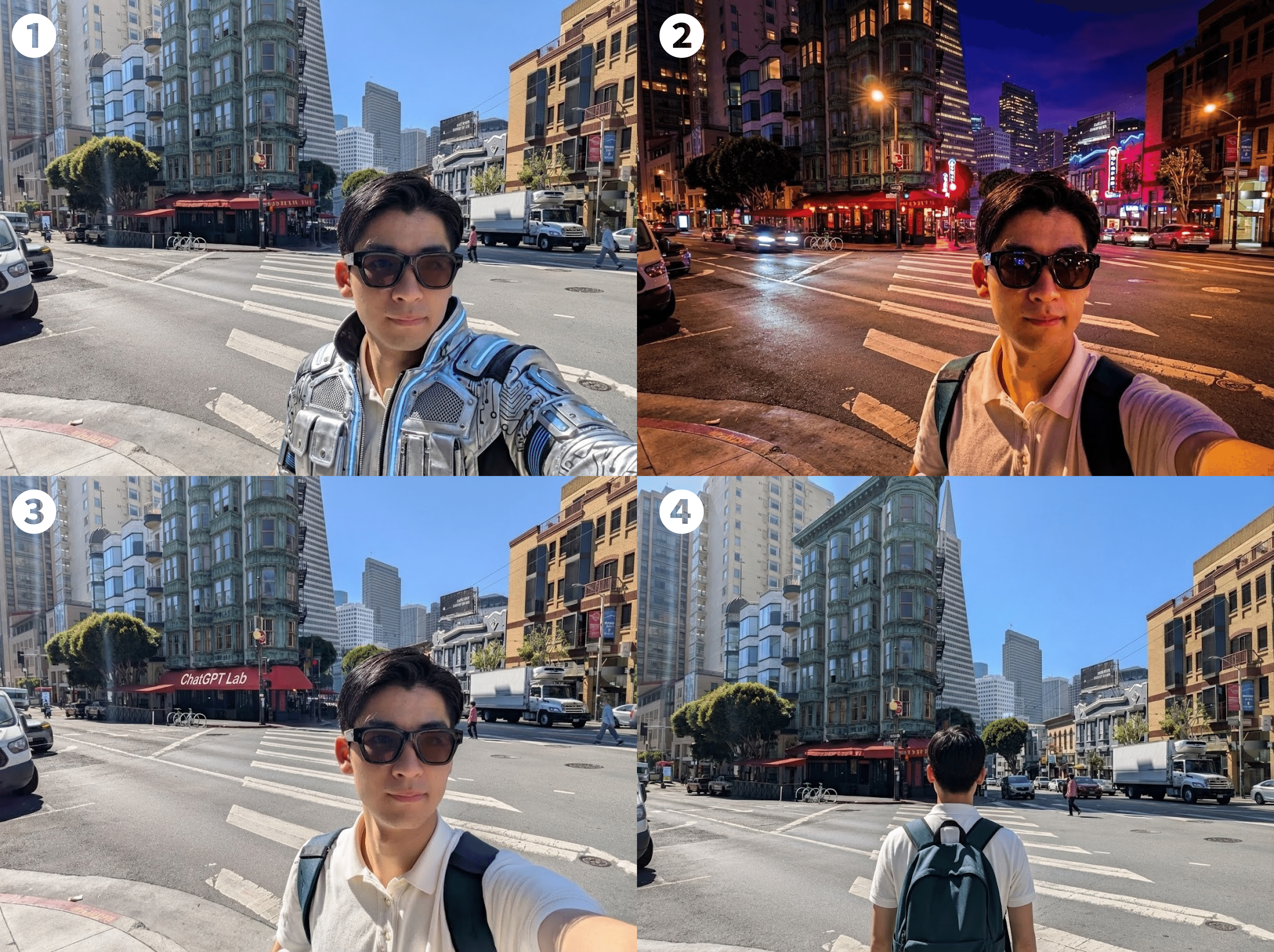 人物の写真をベースに、構図の変更、衣装の変更、テキスト合成、環境光の変更という4パターンの編集を試しました。