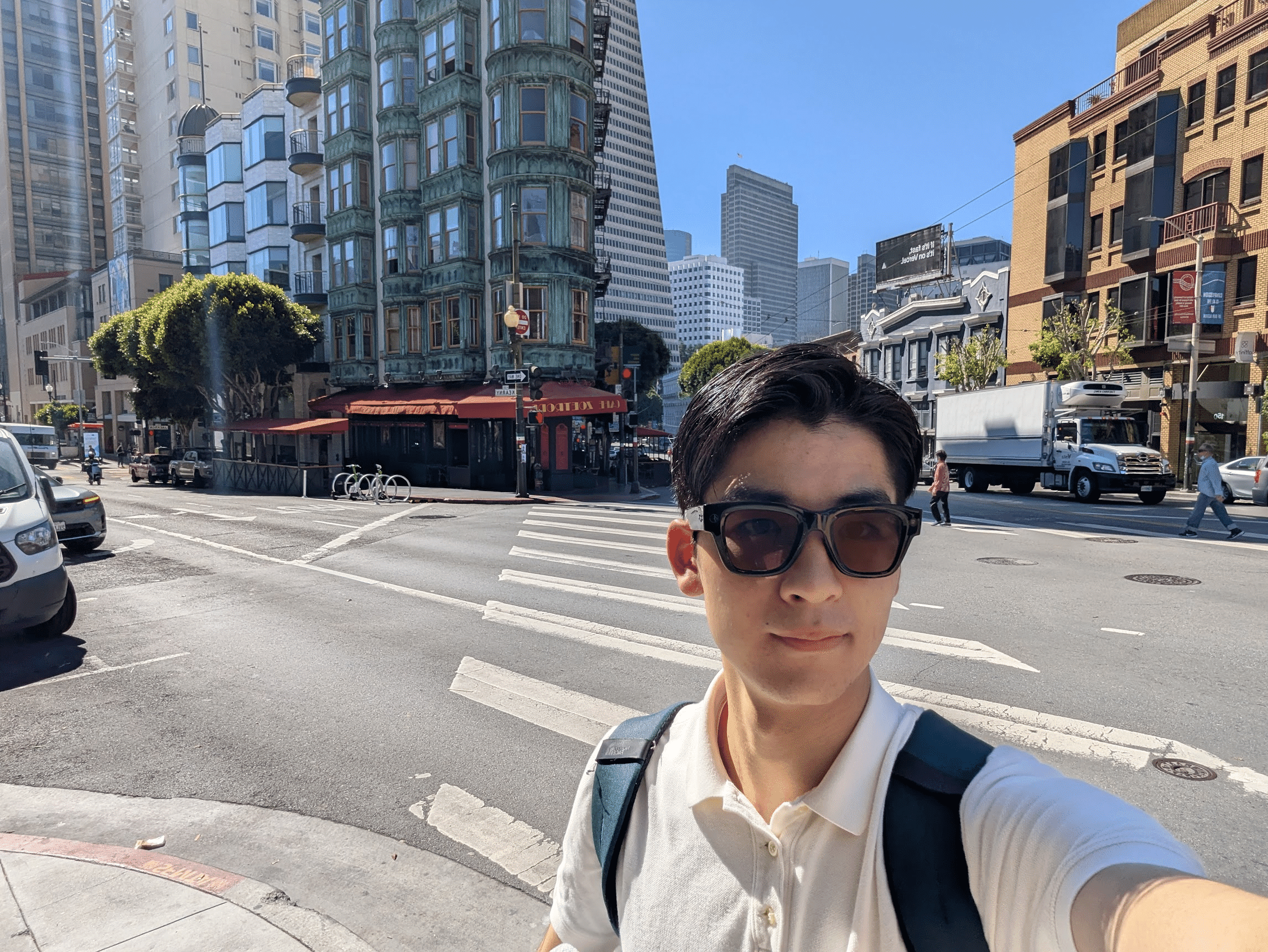 ④カメラが人物の背後に回り込み、白いポロシャツと緑のリュックを背負って交差点に立っている後ろ姿を、同じ街並みを背景にして撮影して。