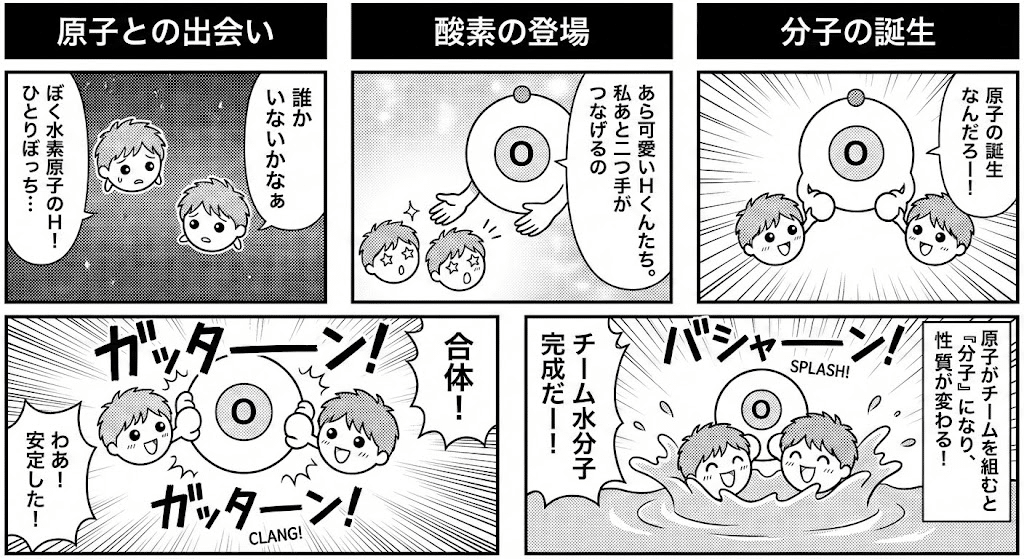 分子の仕組みを四コマ漫画で説明して欲しい!