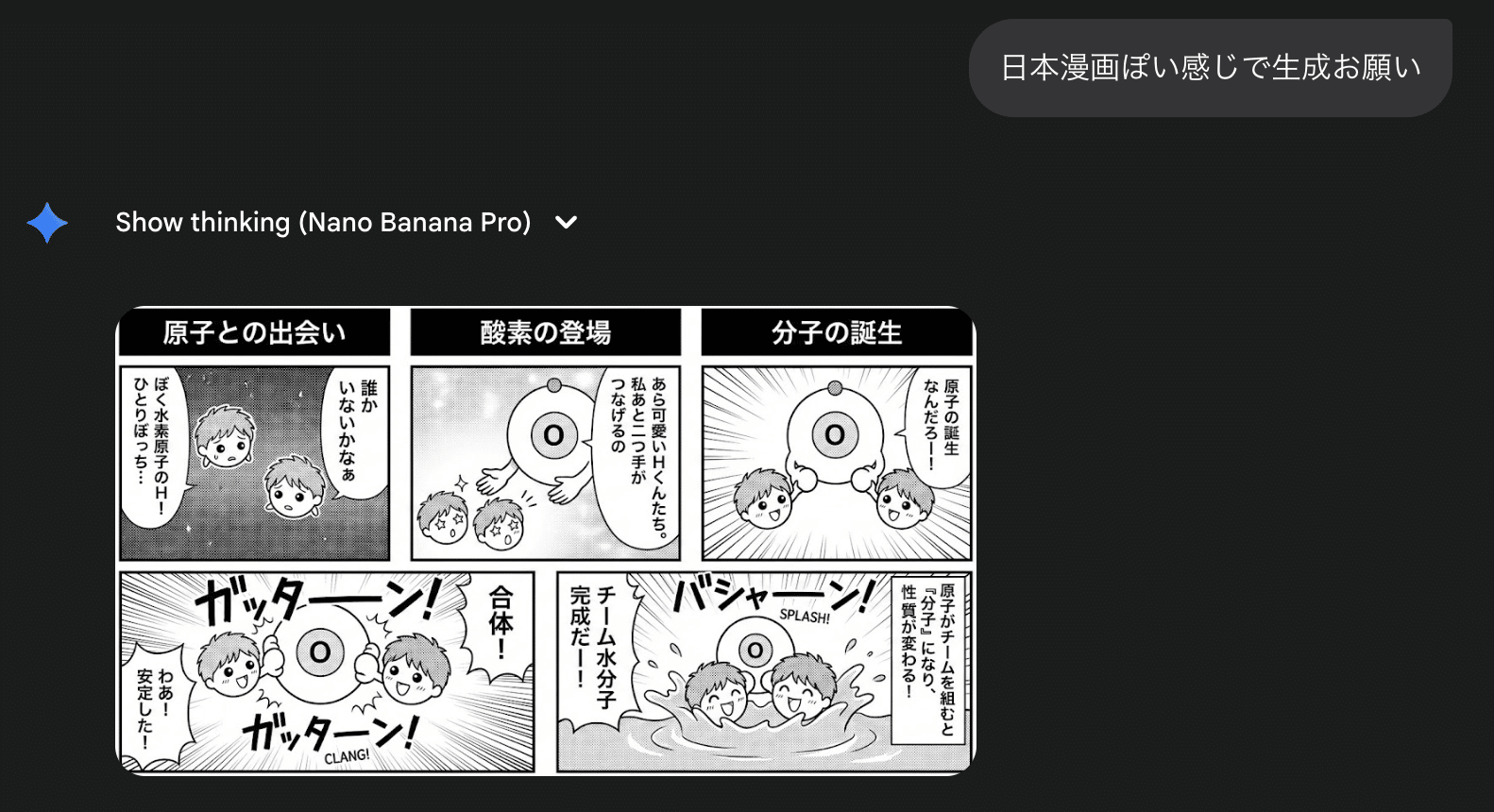 さらに、「水(H2O)」の分子構造といった科学的な内容についても、ハルシネーションを起こさずに正しい図解を生成しています。