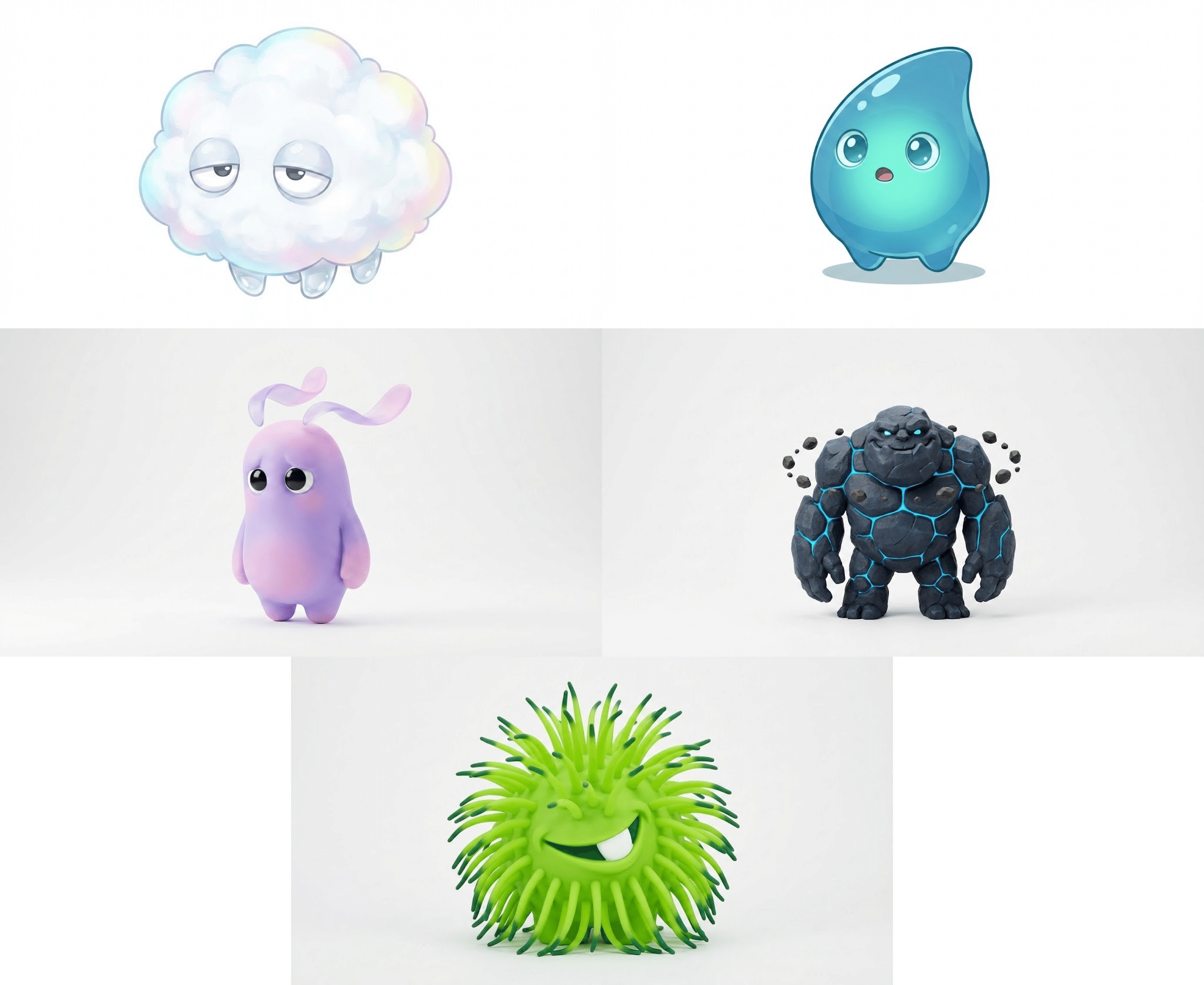 添付した5体のモンスターキャラクターが、白背景のスタジオで横一列に並んで立っているシーンを生成してください。全員フルボディで、正面を向いている。同じカメラ位置・同じ構図・同じ照明条件で撮影したような統一感を重視。
