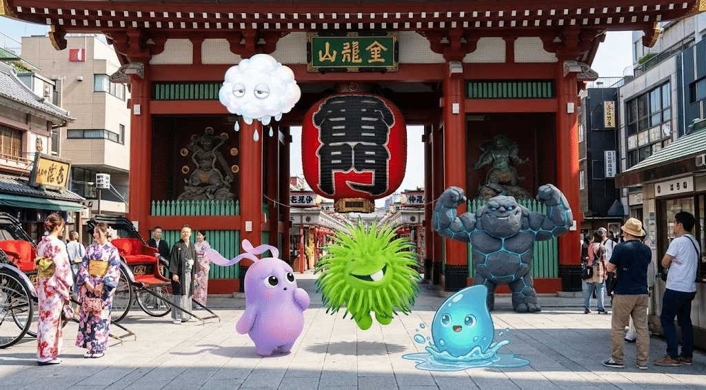 雷門に遊びに来た5体のモンスターが、実際の観光スポットに立って記念写真を撮っているシーンを生成してください。(中略)キャラクターは現地に溶け込む形で立ち、照明や影もその場の光環境に合わせる。