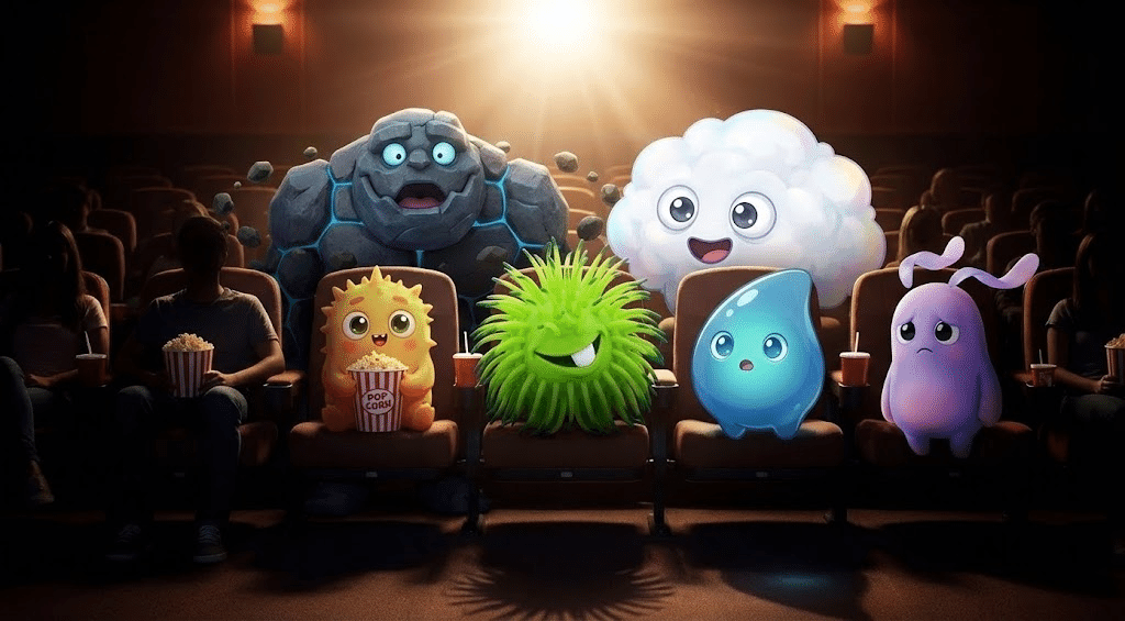 映画館の中で映画を見ている5体のモンスターの様子を描写してください。(中略)それぞれのモンスターが反応の違う表情(驚いている、ワクワクしている、笑っているなど)をしていてもOK。