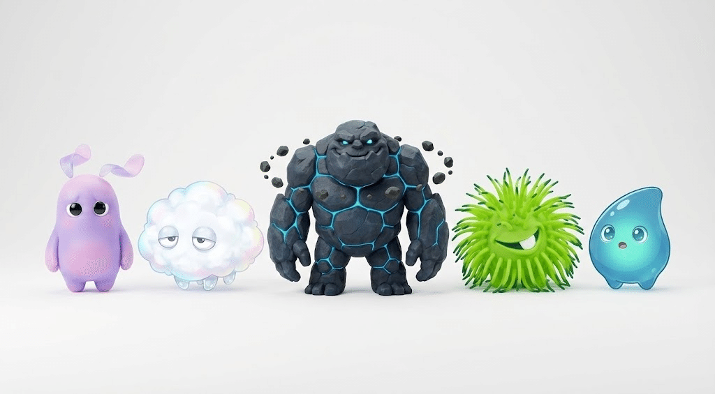 自前で生成した5体のオリジナルモンスター画像を添付し、様々なシチュエーションで遊ばせてみました: