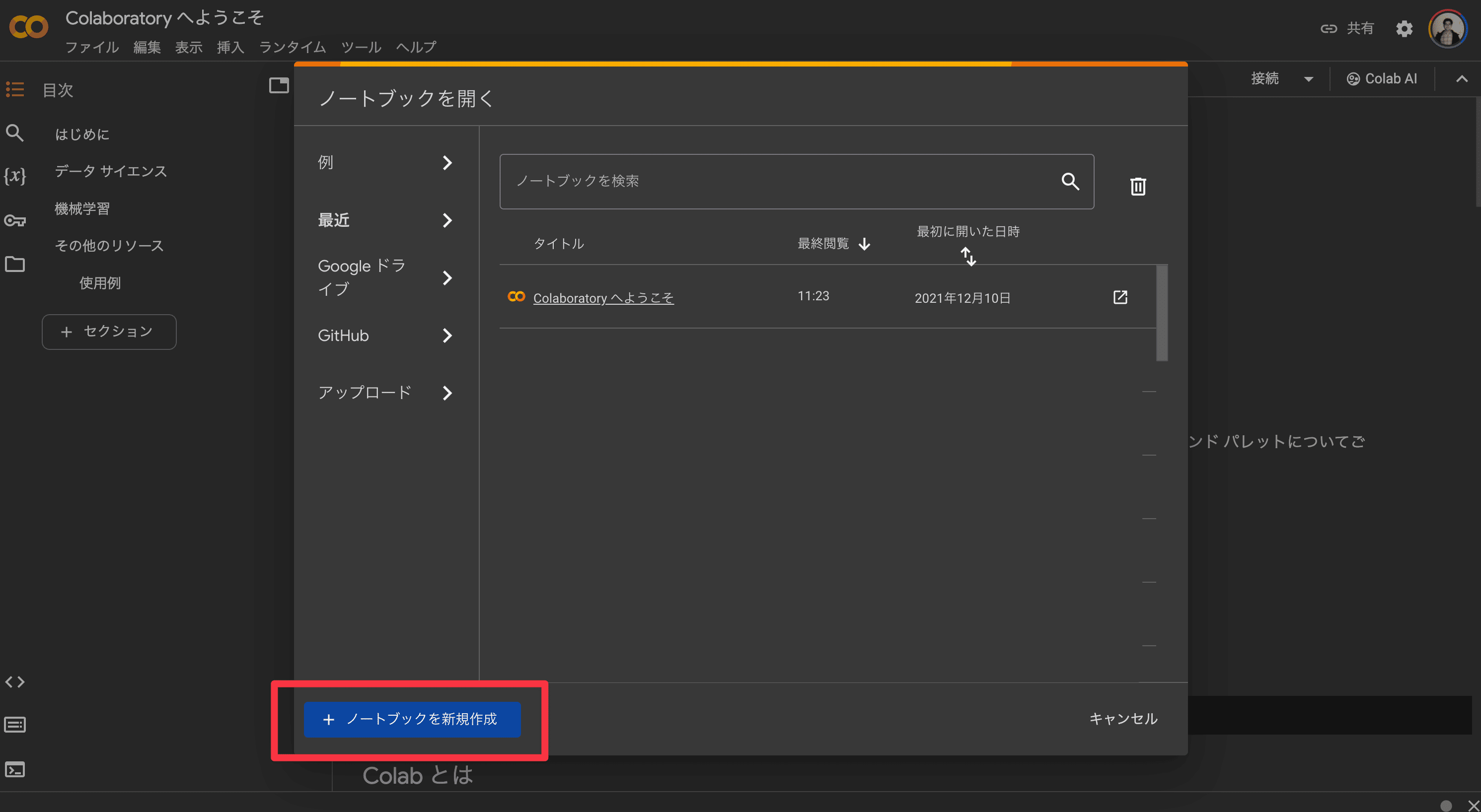 Google Colabのホームページ(https://colab.research.google.com/)にアクセスし、「ノートブックの新規作成」をクリックします。