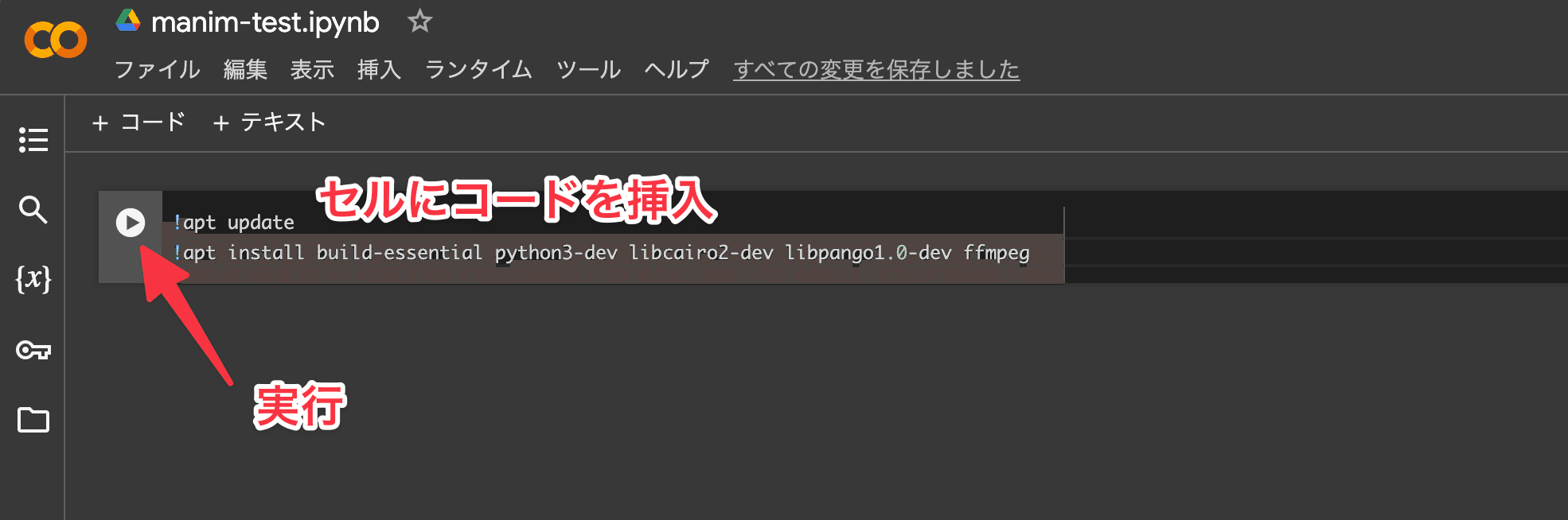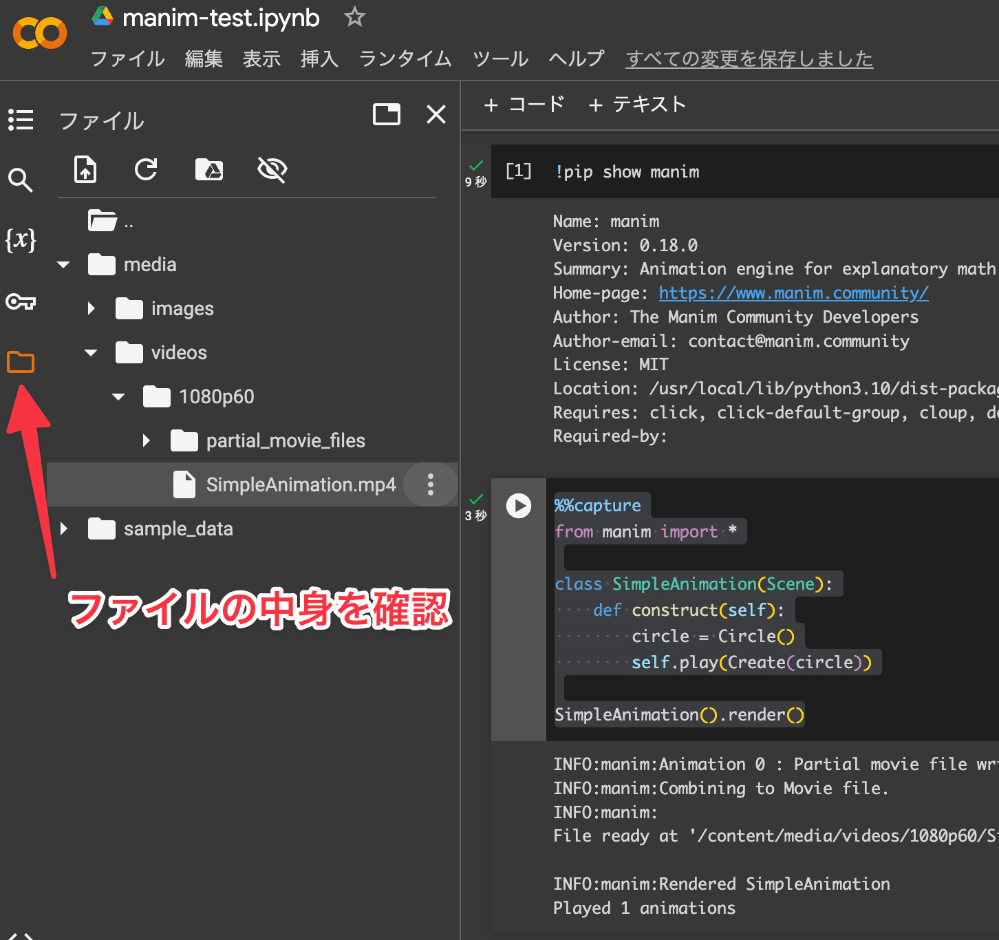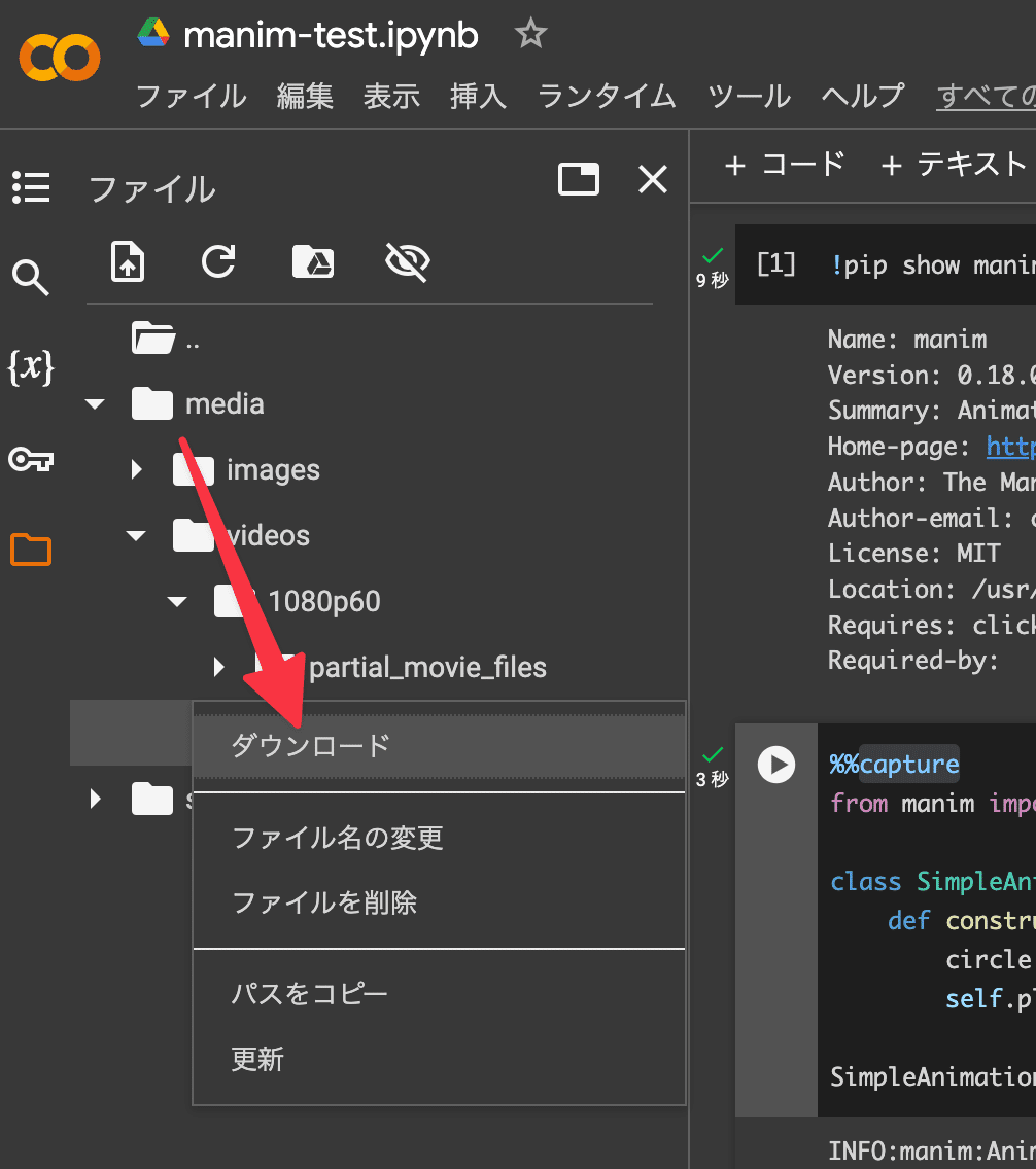 これで、Google Colab上でManimを使うための環境設定が完了しました。次のセクションでは、実際にManimのコードを書いて、シンプルなアニメーションを作成してみましょう。
