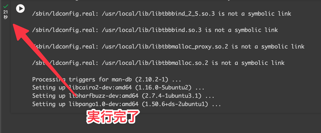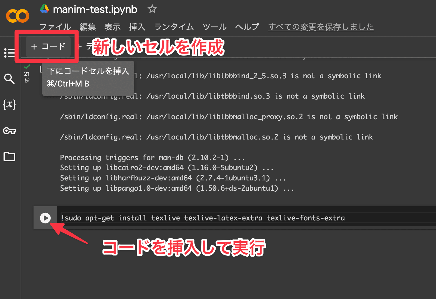注意: インストール作業は、各コードを別々のセルで実行することをおすすめします。一度に全てのコードを実行すると、クラッシュが起こる可能性があります。
