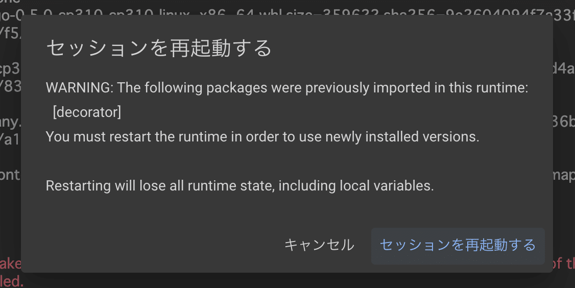 !pip show manim注意: Manimのインストール後、「WARNING: The following packages were previously imported in this runtime: [decorator]」というメッセージが表示され、セッションの再起動を促される場合があります。その場合は、メッセージ下部の「Restart Runtime」ボタンをクリックして、セッションを再起動してください。再起動後、新しいセルを作成し、残りの手順を続けます。