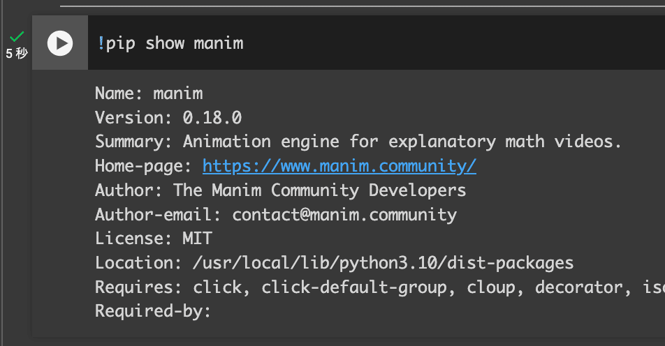 !pip show manim上記を実行して、以下のように出力されたら成功です!