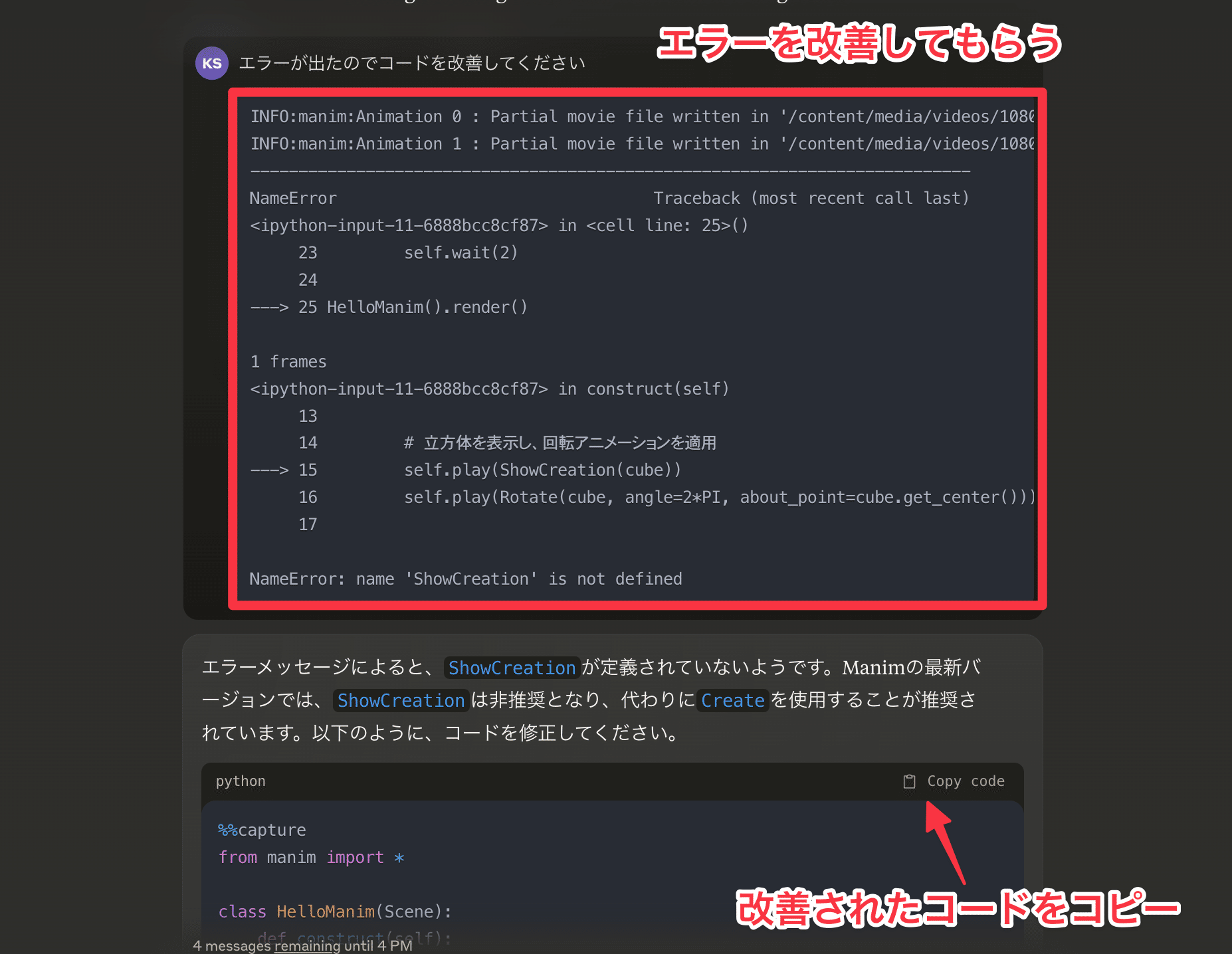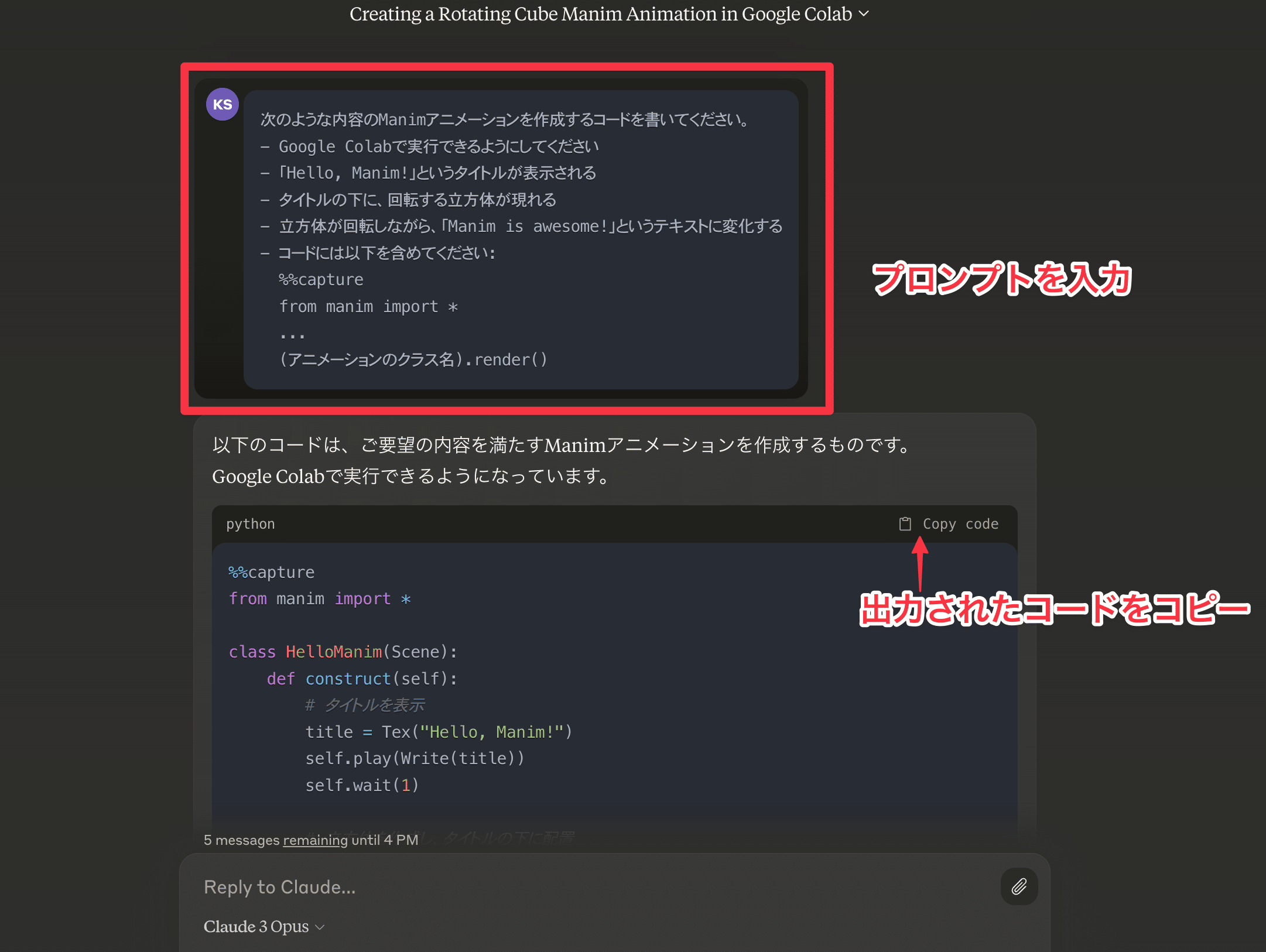 このように、Claude3を活用することで、プログラミングの知識が少ない人でも、簡単にManimのコードを生成できます。