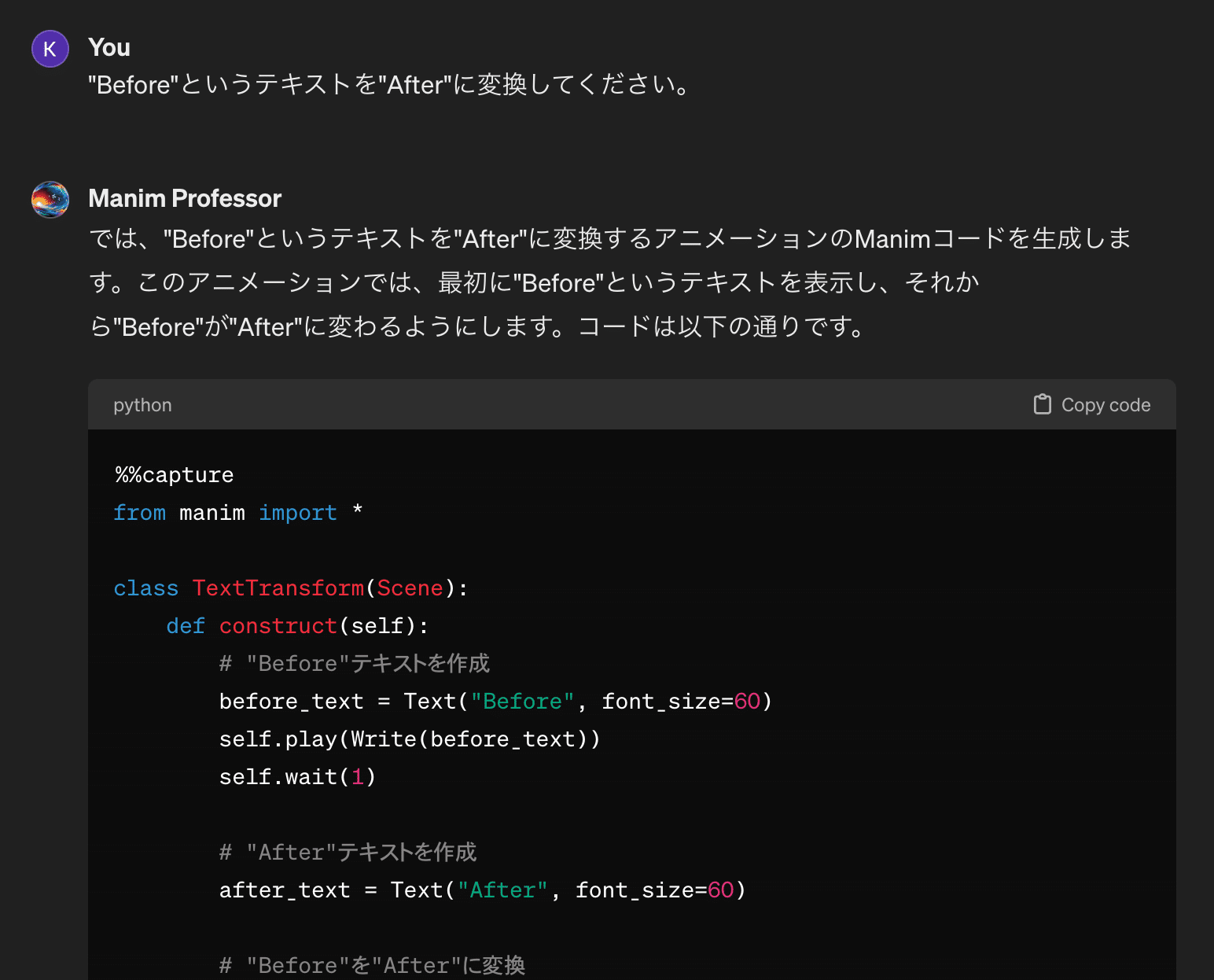 Manimコード生成GPTsでManimコードを生成