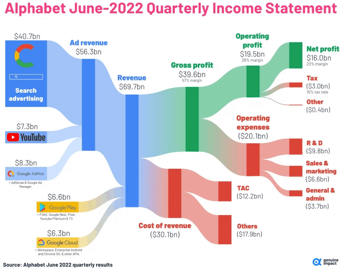 Googleは2022年6月に69.7億ドルの収益を上げました。そして、その純利益は16億ドルで、利益率は23%です。