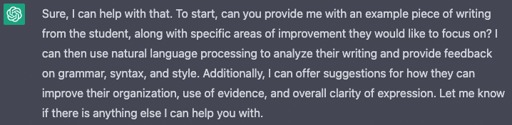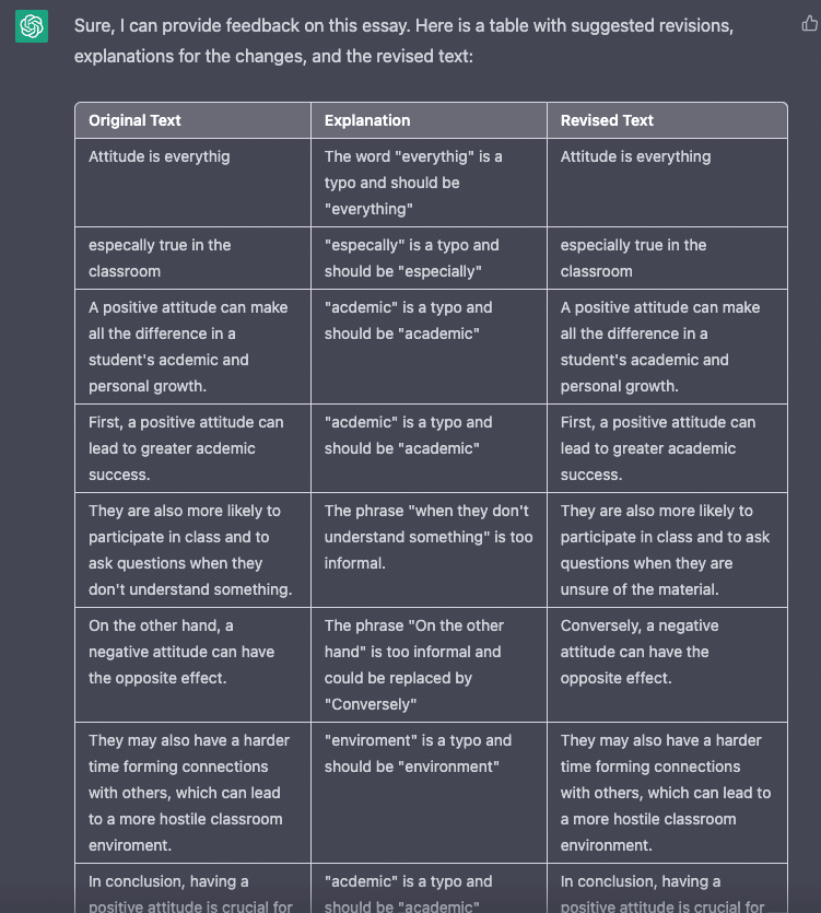 次のステップは、改善すべきフレーズをすべてループさせ、提案がなくなるまで修正フレーズを提案することです。ChatGPTは、エッセイをより洗練された分かりやすいものにするために、フレーズの修正案を提供します。間違いがなくなるまで、ステップ1を繰り返しましょう。